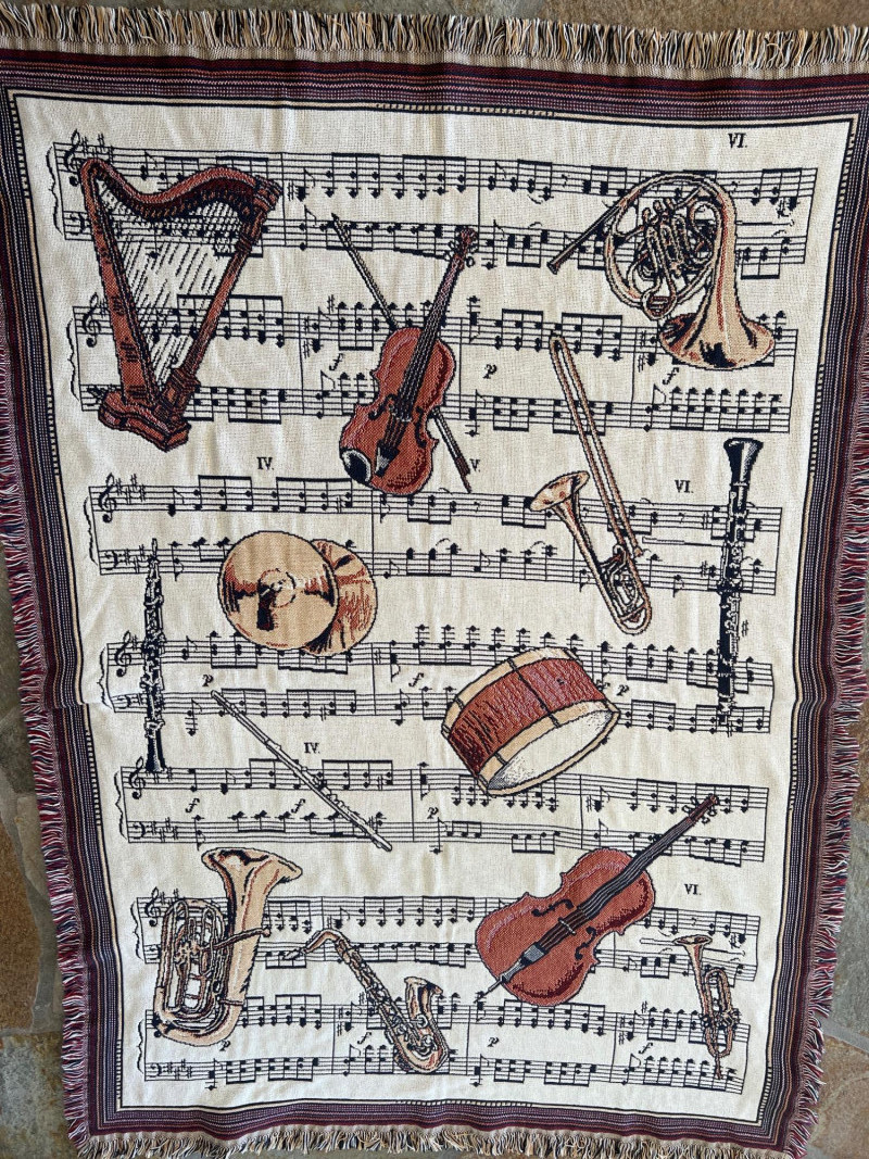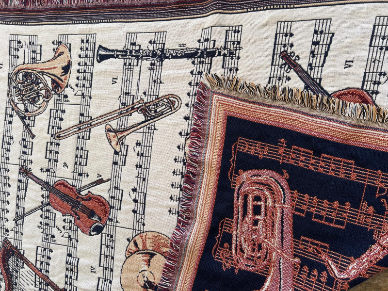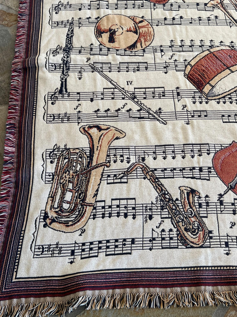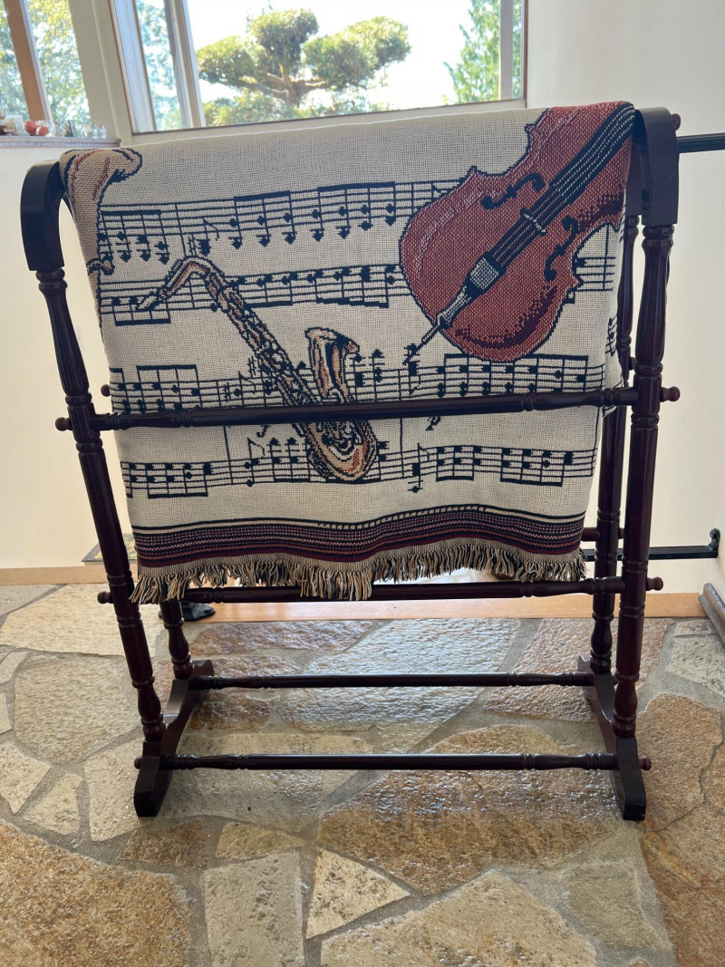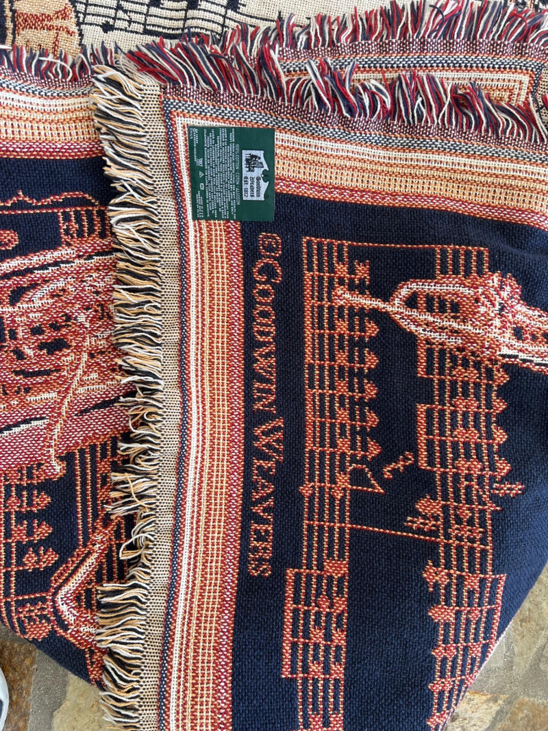 Finely crafted Goodwin Weavers multi-colored woven throw/blanket. Musical themed. Has the Goodwin Weavers label and brand name woven into blanket. Also included is a wood blanket rack with turned wood detailing. Rack measures 28” width x 32.5" height Blanket measures: