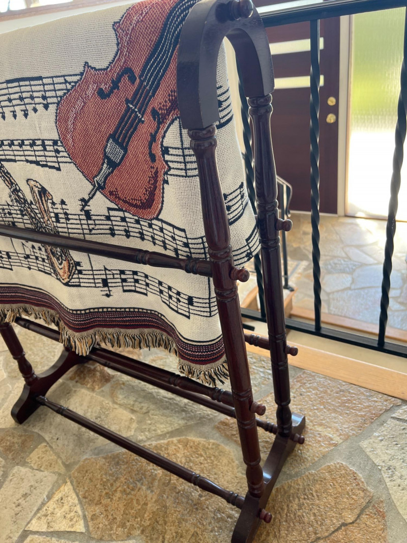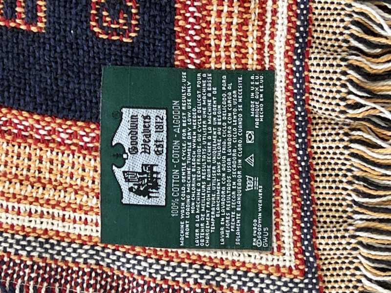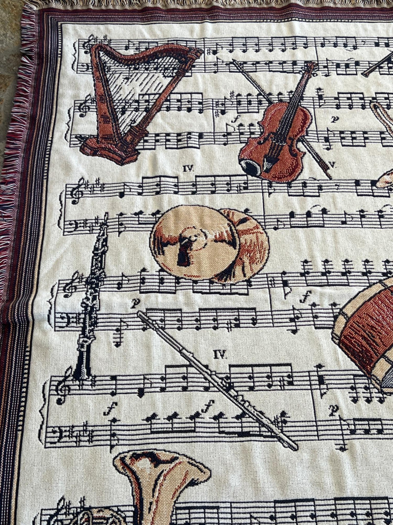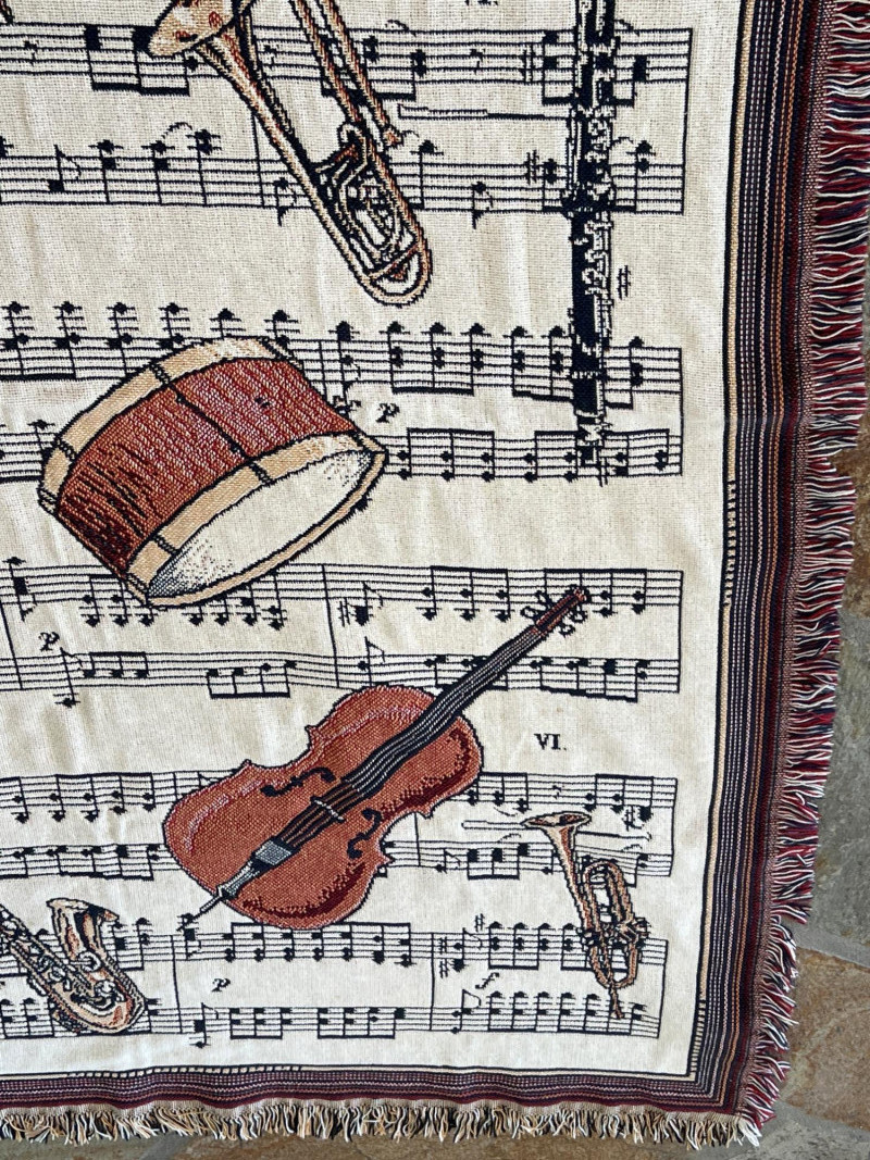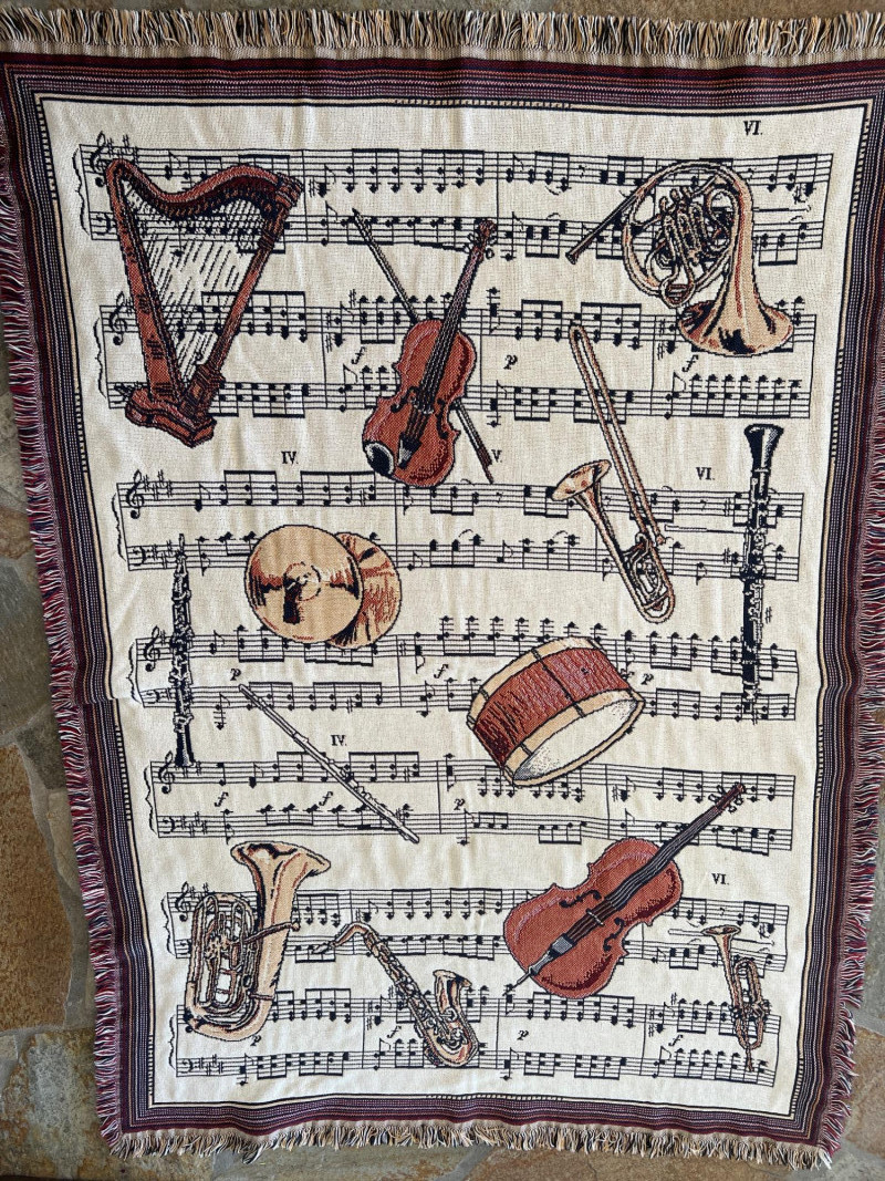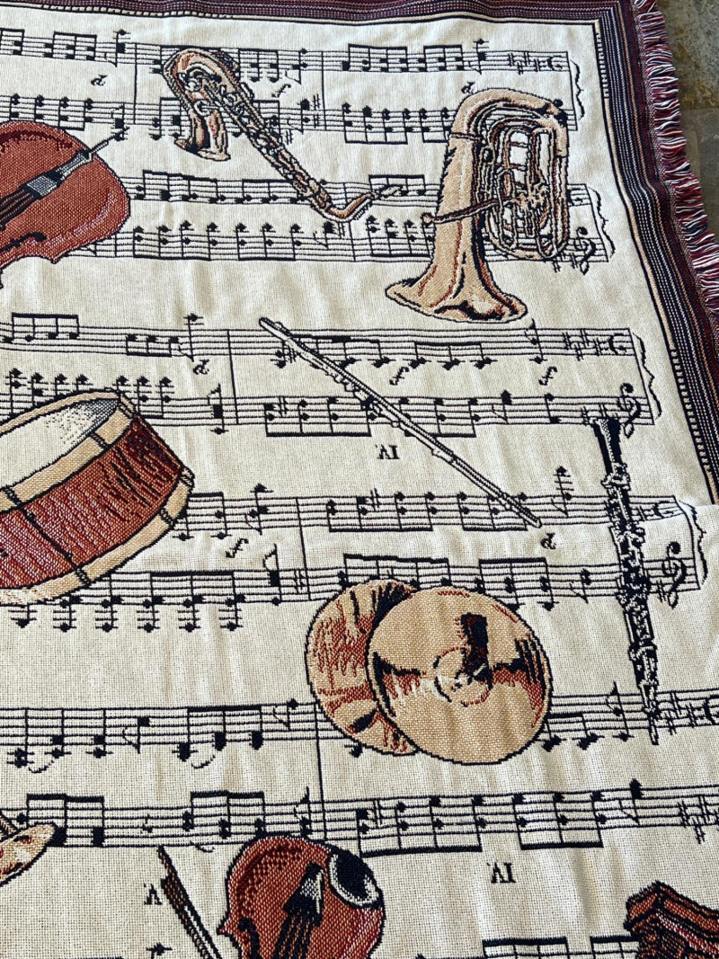 Finely crafted Goodwin Weavers multi-colored woven throw/blanket. Musical themed. Has the Goodwin Weavers label and brand name woven into blanket. Also included is a wood blanket rack with turned wood detailing. Rack measures 28” width x 32.5" height Blanket measures: