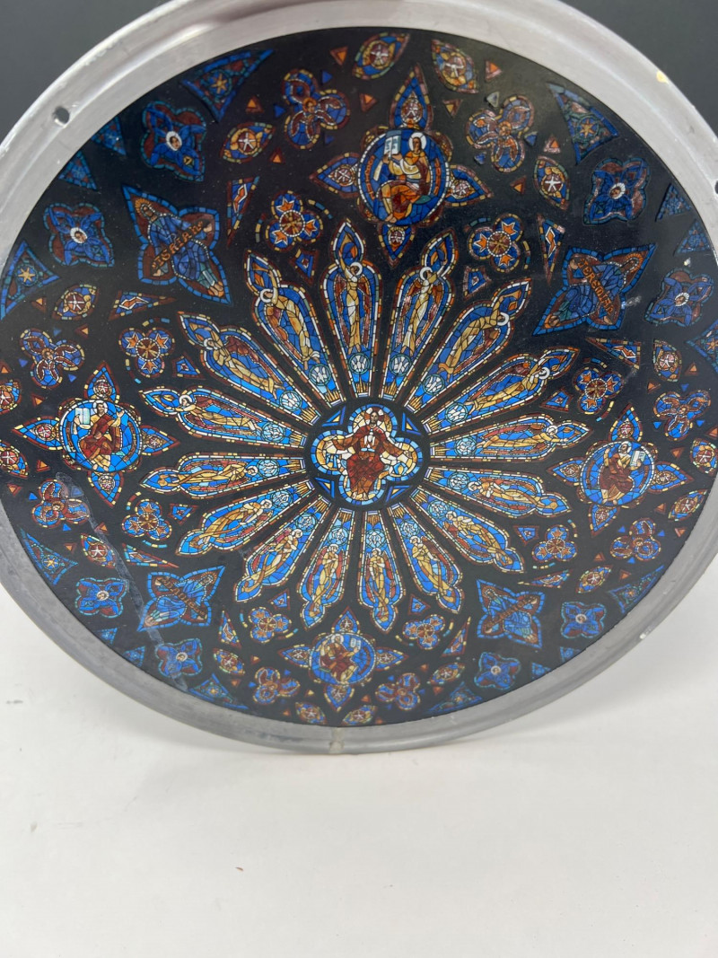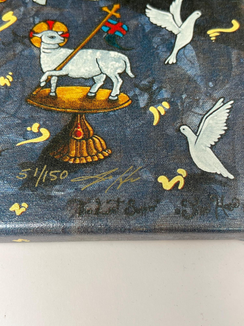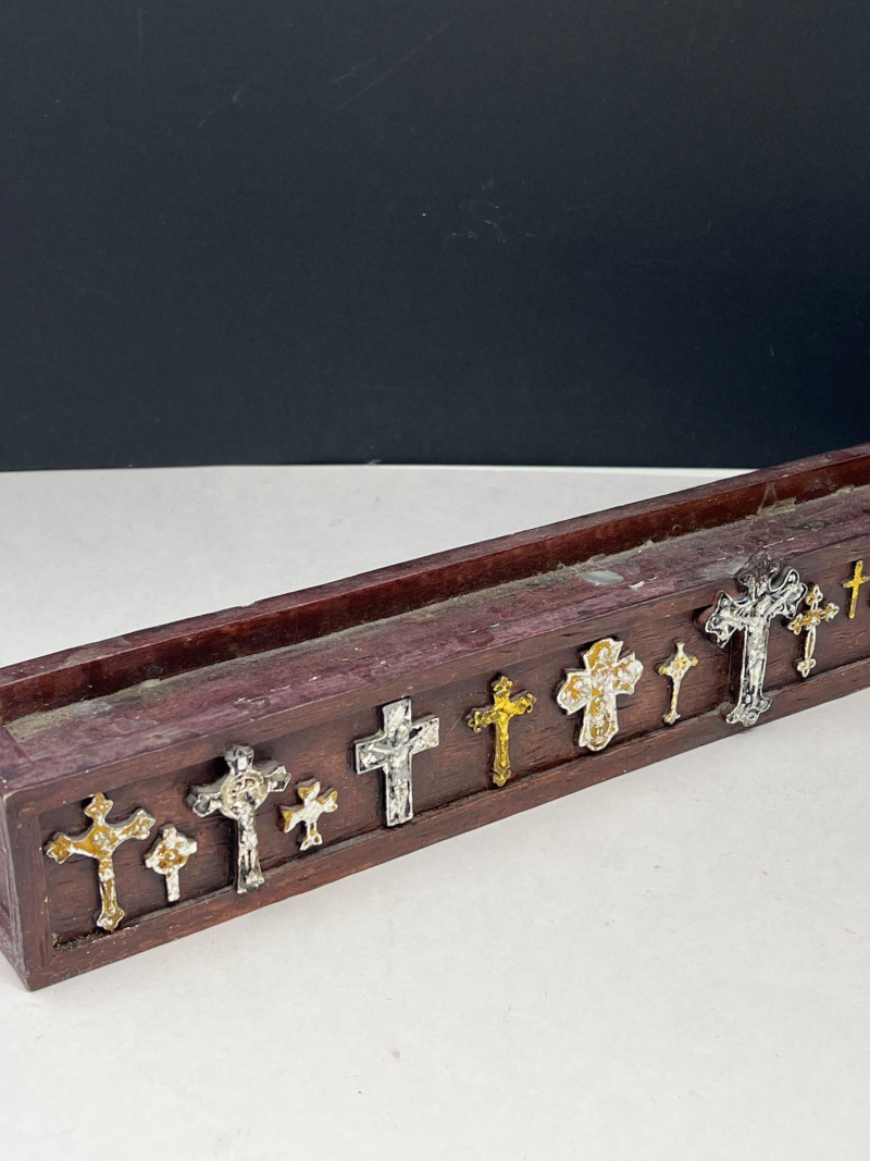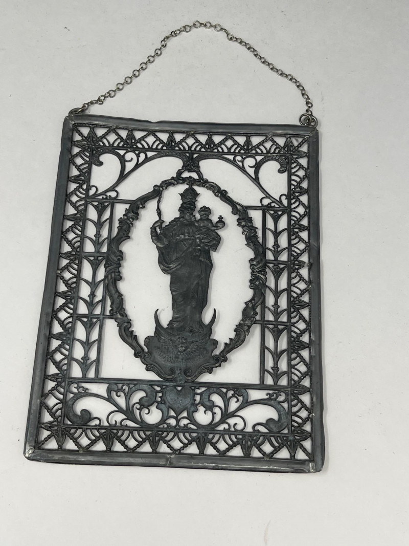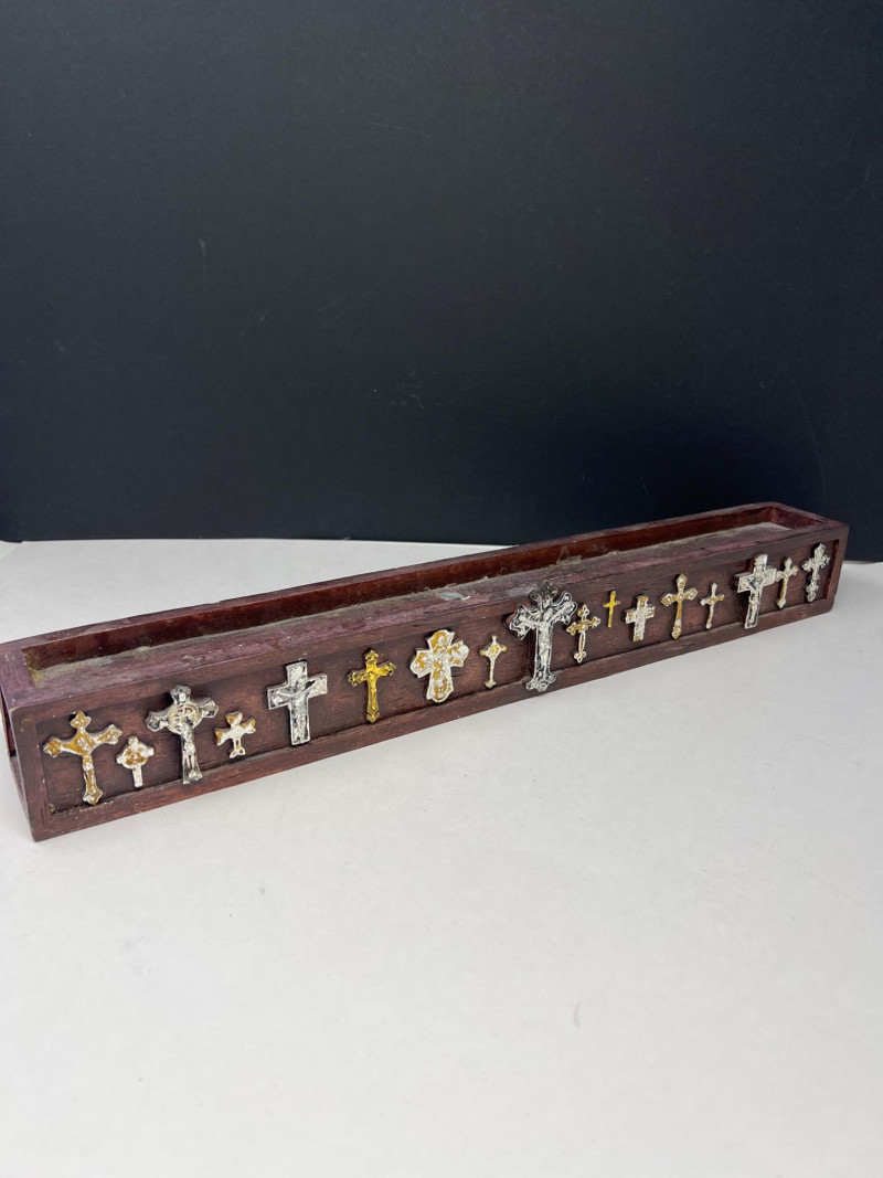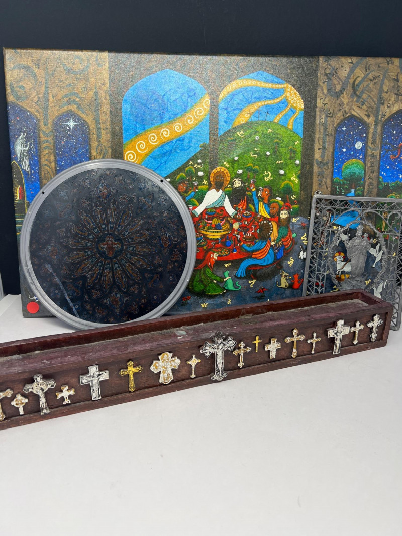 Limited edition print on canvas. Numbered 51 of 150. Artist signed. Printed on canvas and coated. Depiction of the Last Supper. 24 inches x 15.75 inches. Round stained glass window hanging that celebrates the Cathedral of St. John the Divine in New York City. 10.5 inches round. Cut pewter wall hanging from Bavaria depicting a saintly figure with a child. Intricate metal work. 6 inches x 8.25 inches. Long bar votive holder with diverse crosses that convey unity in faith and design. Appears to be wood but it is likely resign. 21 inches long x 2.75" x 2.75"