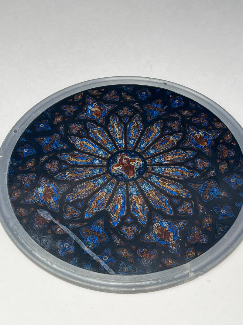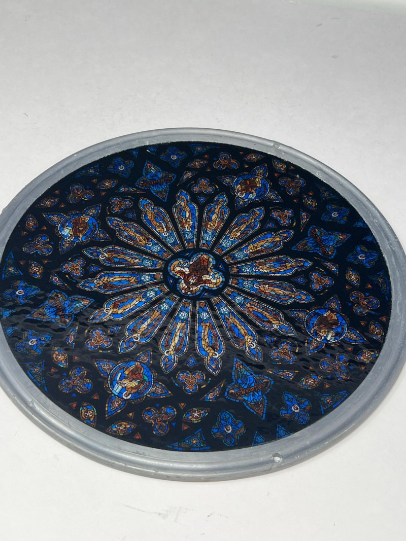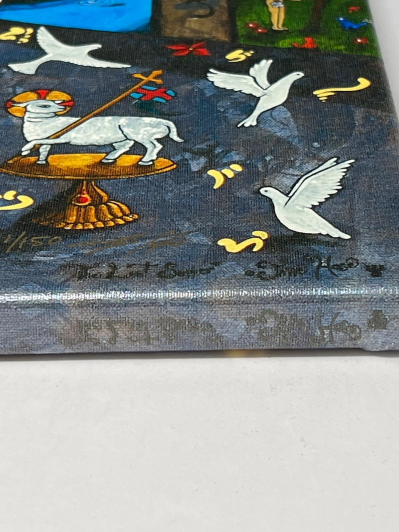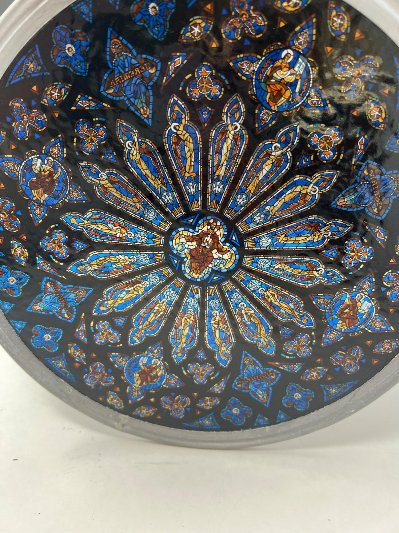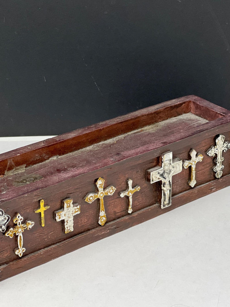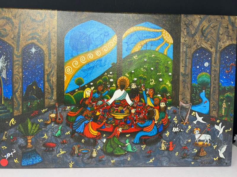 Limited edition print on canvas. Numbered 51 of 150. Artist signed. Printed on canvas and coated. Depiction of the Last Supper. 24 inches x 15.75 inches. Round stained glass window hanging that celebrates the Cathedral of St. John the Divine in New York City. 10.5 inches round. Cut pewter wall hanging from Bavaria depicting a saintly figure with a child. Intricate metal work. 6 inches x 8.25 inches. Long bar votive holder with diverse crosses that convey unity in faith and design. Appears to be wood but it is likely resign. 21 inches long x 2.75" x 2.75"