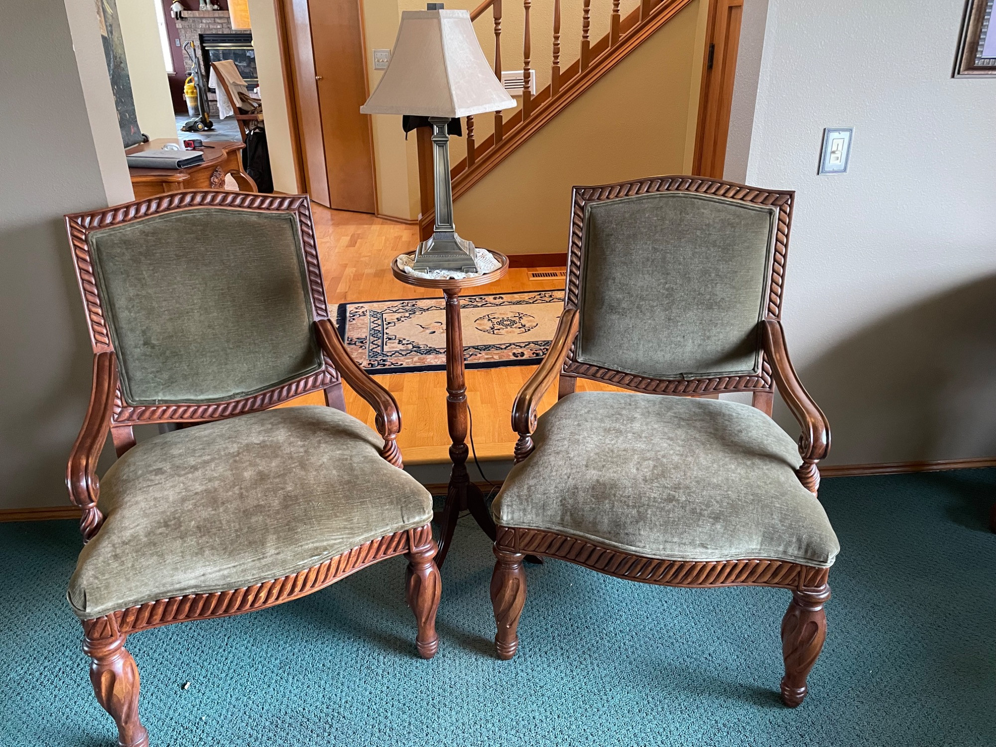 2 FlexSteel Industries Green side chairs. Seat 27" x 26" x 40" high Table 11' round x 35" high. Damage on top, comes with cream color doily. Brushed Brass Lamp 22" high x 6" square base