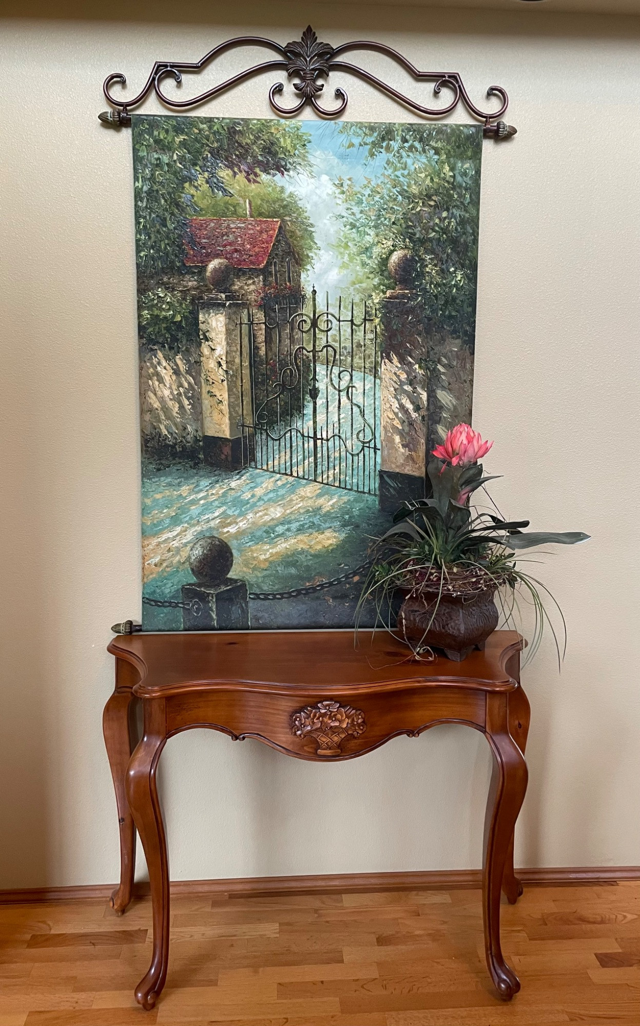 Bombay console table 45" x 17 1/2 " x 30 34" high. Great condition Tuscan Garden Wall Art w/decorative wall hanger, 36" x 54" with wall hanger 62" high Includes decorative plant