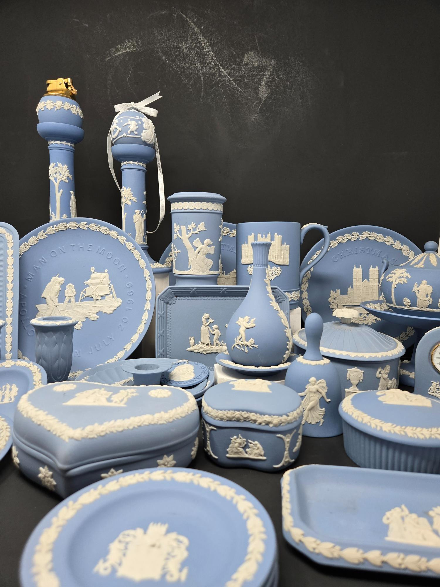 33 Piece Collection of Wedgewood's Blue and White Jasperware. 4 trinket boxes 2 slightly larger trinket boxes 'fairy lamp' bell clock small vase lighter 5 candle holders 2 small display plates (one broken & glued back together) 5 trinket dishes 2 Christmas plates small plate on pedestal 3 small cups/1 chipped-see photo 1 slightly larger cup/vase Apollo 11 1969 display plate 1 picture frame 3 Christmas tree ornaments *Please note the photos of the 2 damaged pieces