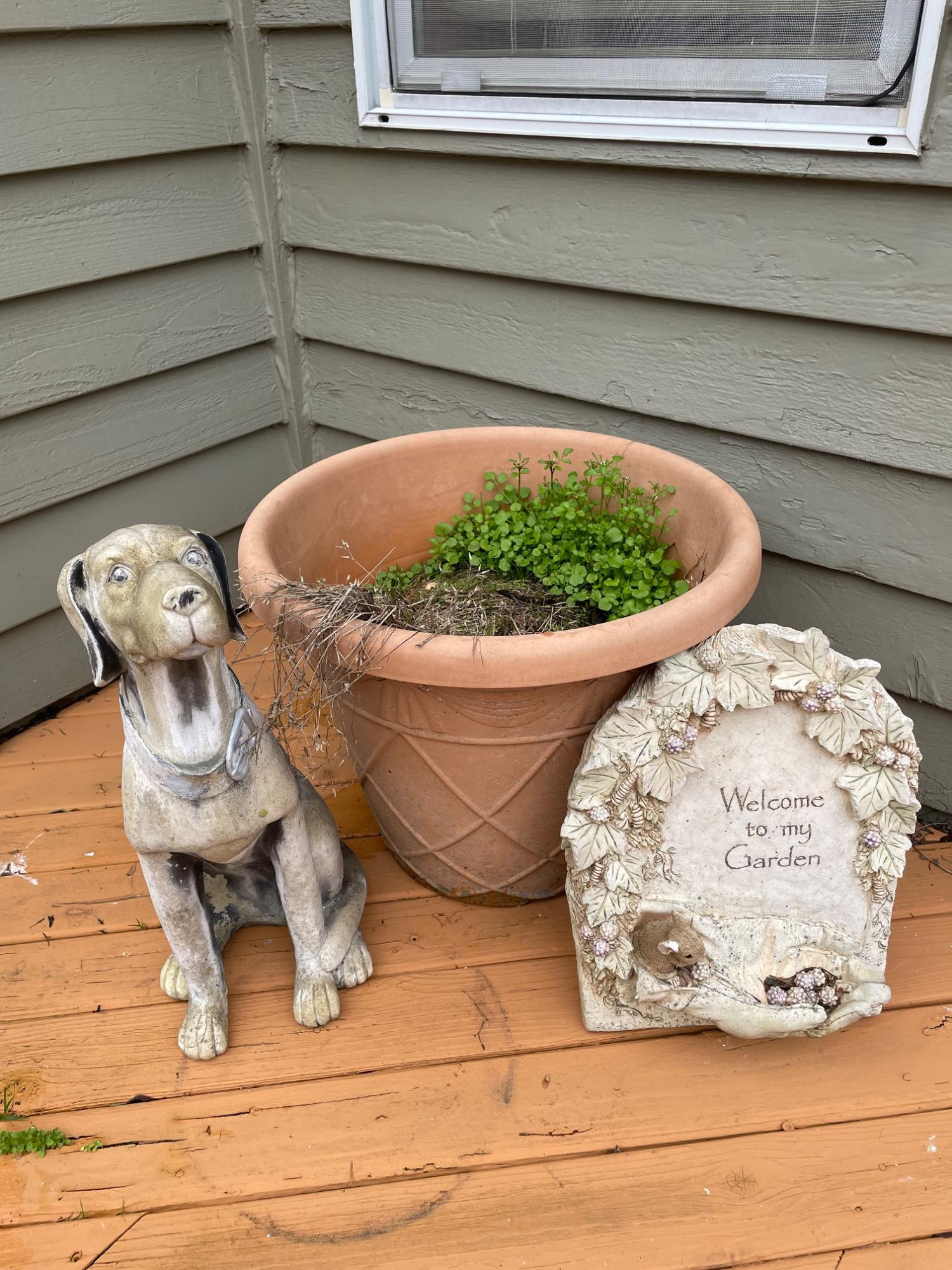 Resin Dog 18 1/2" high and base 11" Resin 'Welcome to my Garden' art 12" x 13" high Resin Terracotta pot 17" round x 14" high