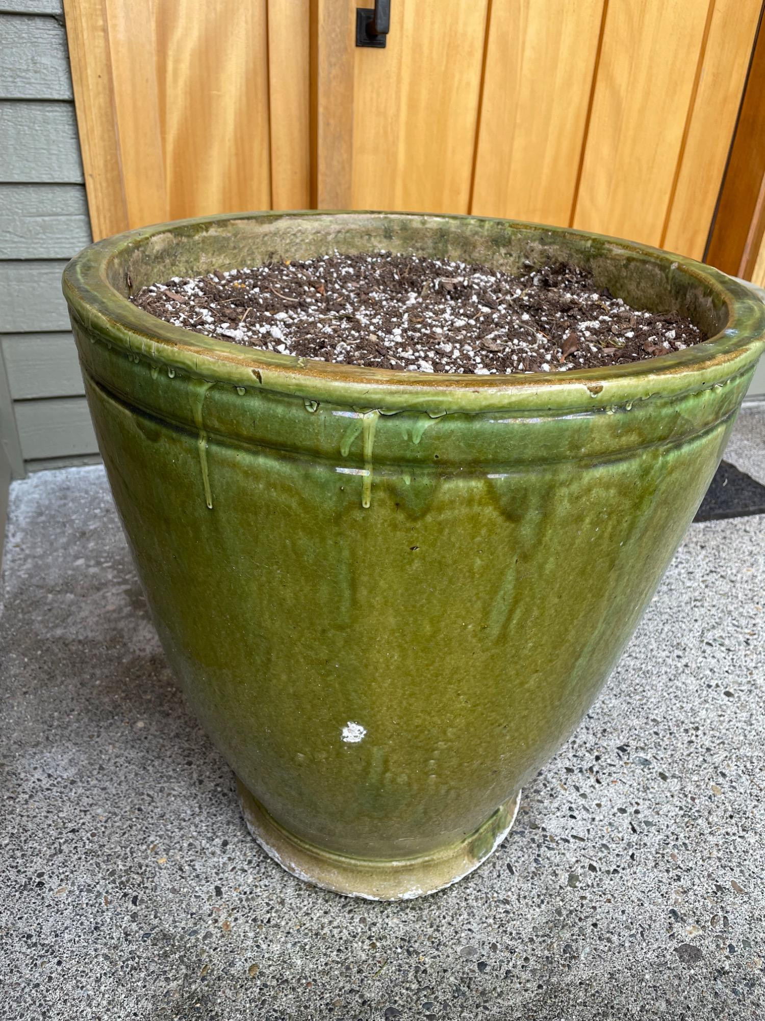 Green Ceramic Pot 21 1/2 high x 19" Round, pot is heavy and there is no one to assist, please bring someone to help loading