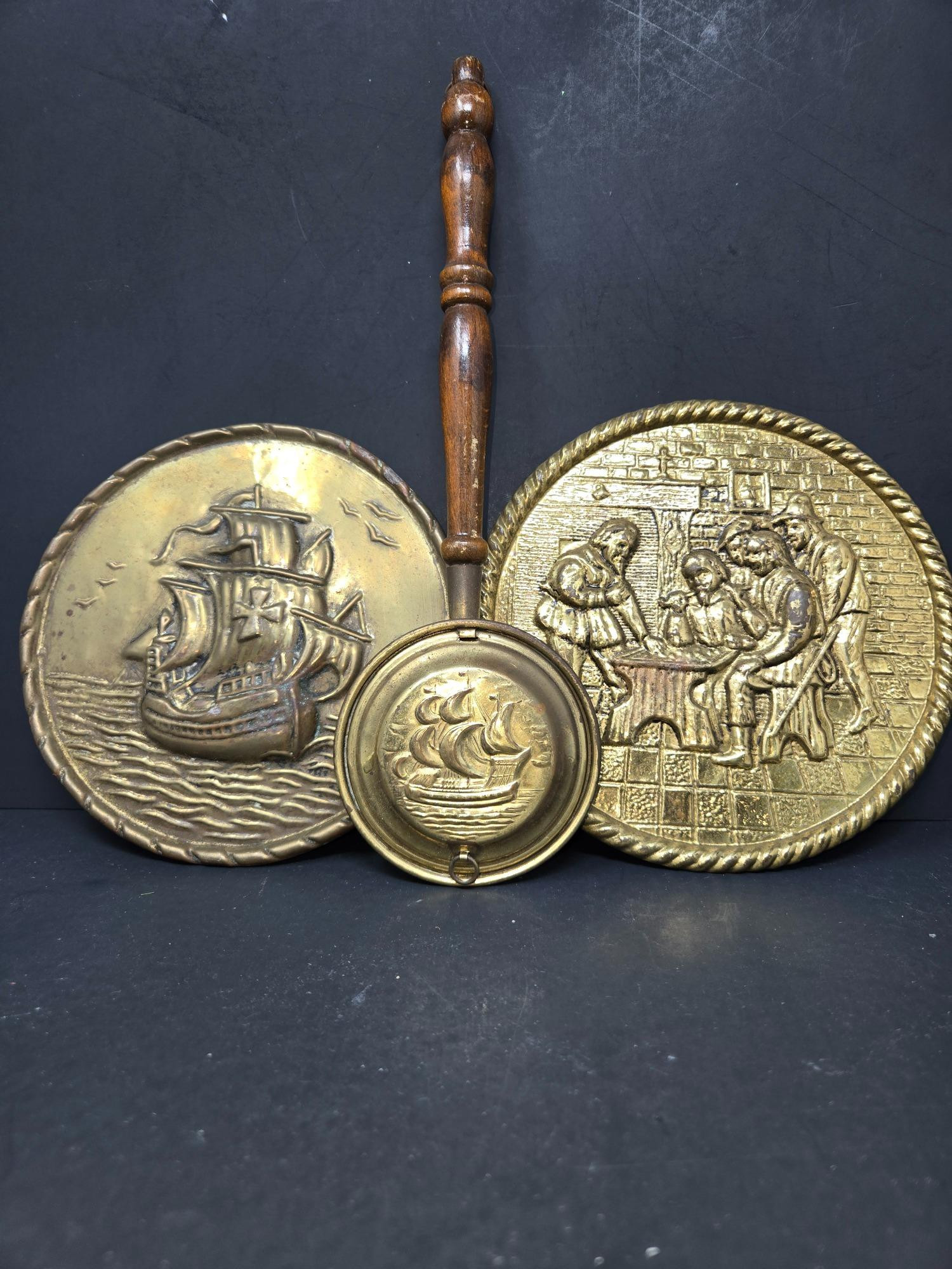 sailing ship. Additional information: It is a decorative item, likely made in England. The plate is made of brass and has a nautical theme. It can be hung on a wall using a hook on the back. The size varies, with diameters around 21-25 cm. It is considered a vintage item, possibly from the mid-20th