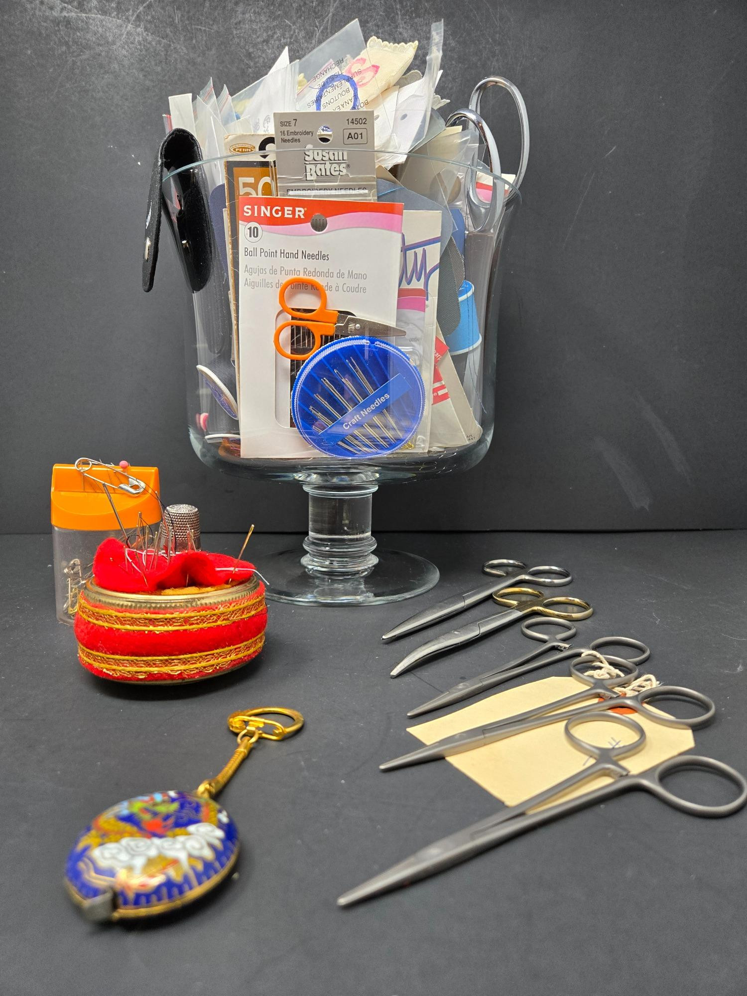 Vintage scissors (5), buttons, thread, snaps, pin cushion, needles, and more... non-vintage Asian inspired measuring tape on a keyring,