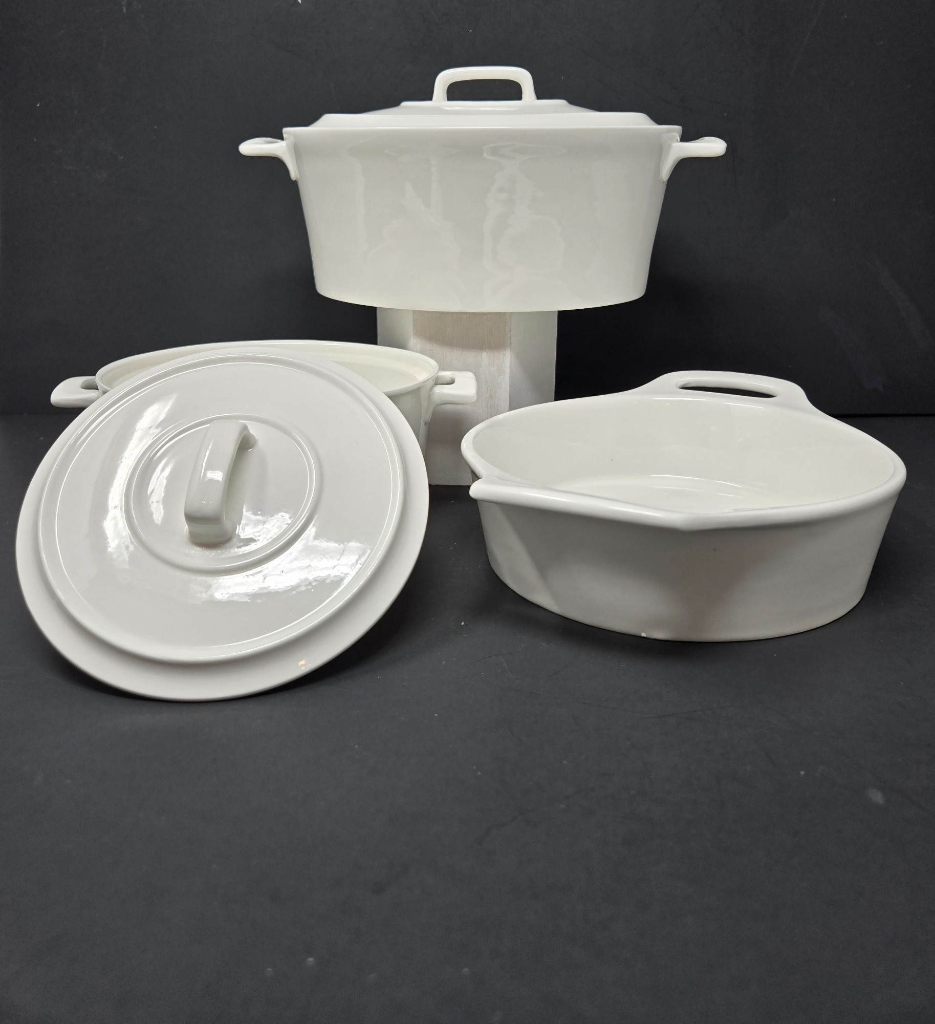 5-piece elegant oven-to-table casserole set Oval 10" arm to arm Small with lid 7 1/2" arm to arm Larger Round 9"