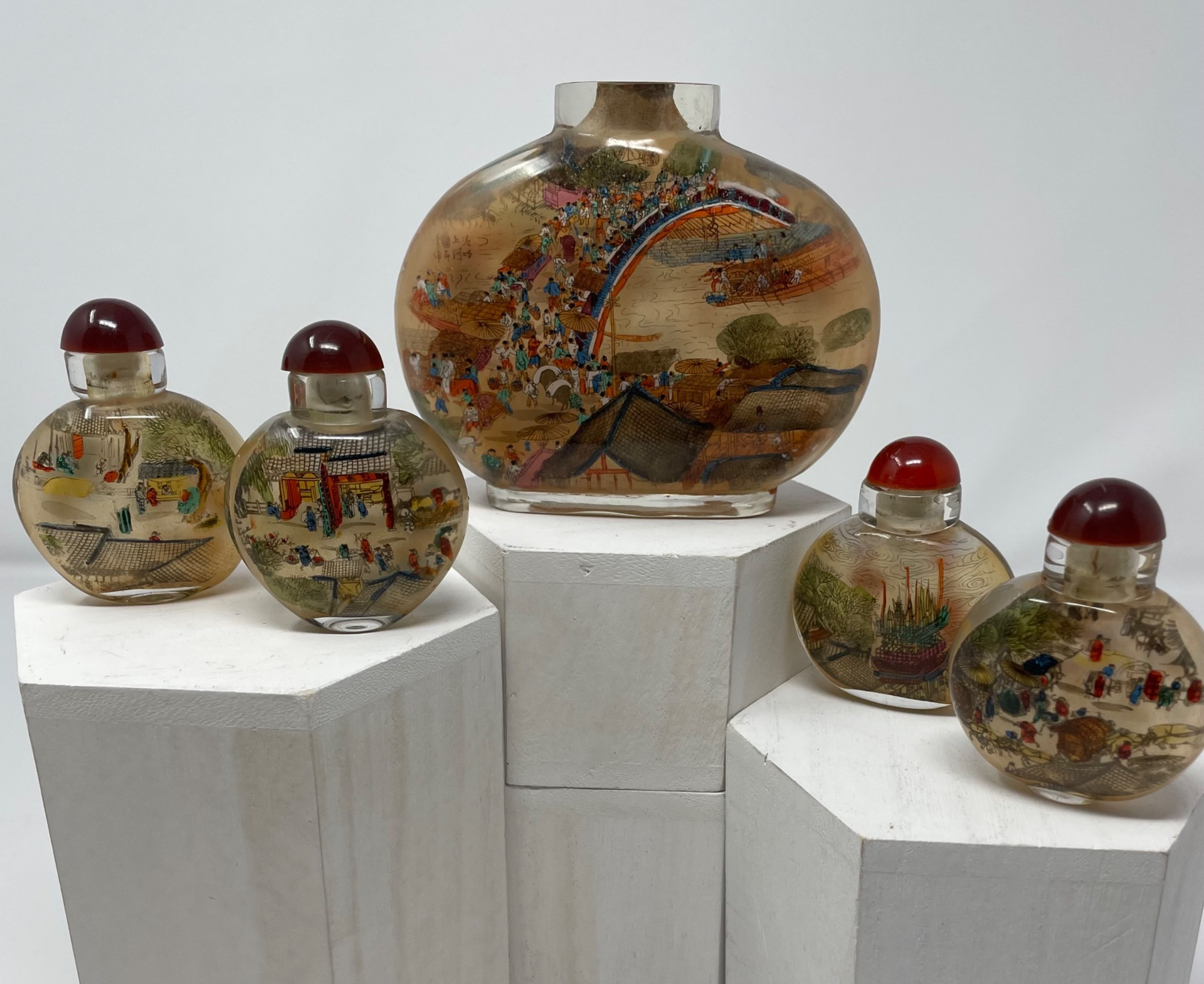 Chinese Snuff bottles emerged in the early 18th century and evolved into decorative art. Snuff was considered a remedy for common illnesses, making the bottles practical and fashionable. Materials vary widely, including glass, porcelain, jade and stone, reflecting Chinese artistic practices. Inside-painted bottles are created using tiny brushes, showcasing intricate scenes. Snuff bottles reflect cultural exchange between China and the West. Large Chinese Snuff bottle without lid 4" x 4 1/2" Smaller Snuff bottles range from 2 1/2" x 2"