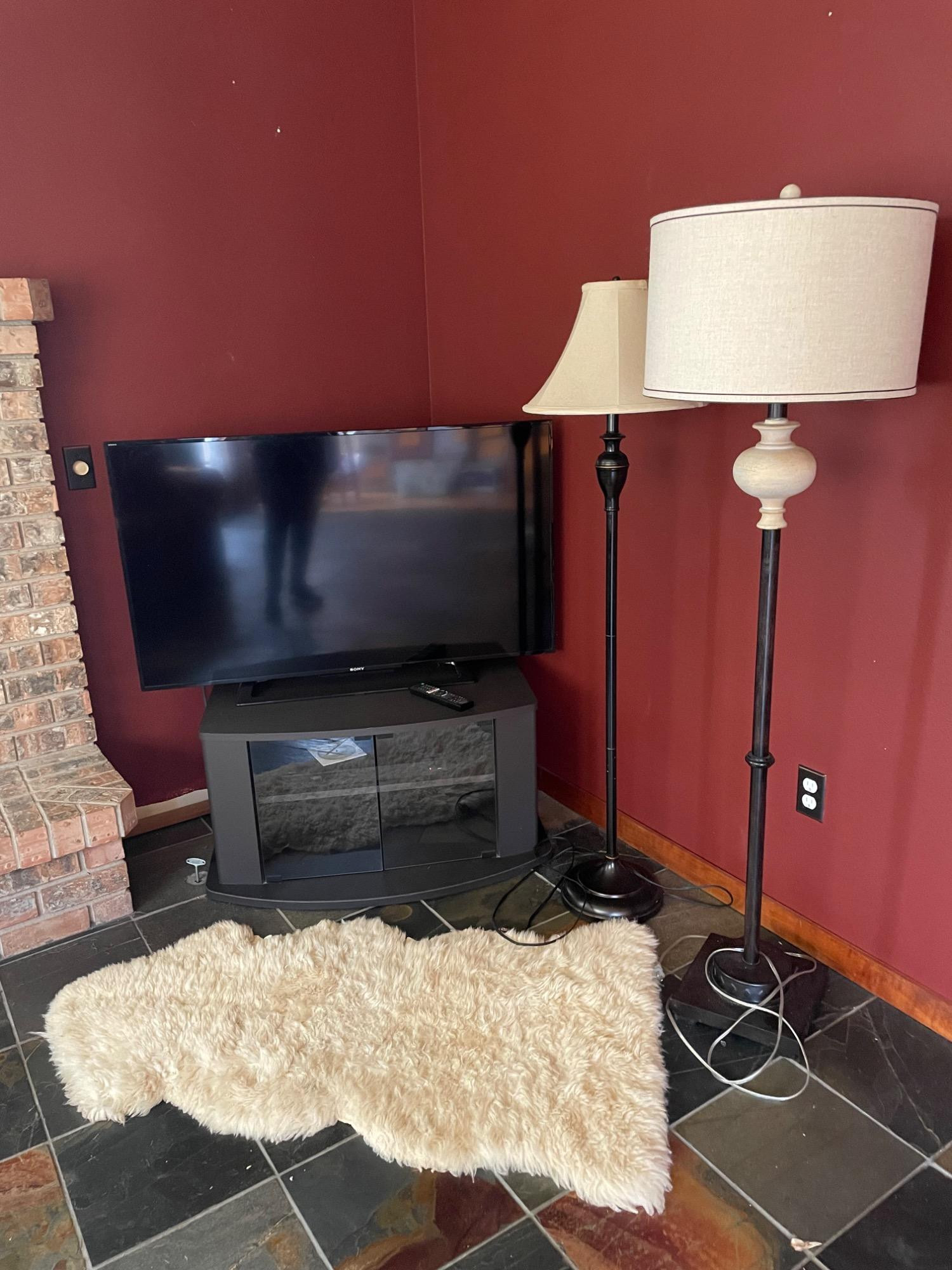 Lot # 167 - 48” Sony TV, Stand, LG Disc Player, Lamps & Sheep Skin Rug