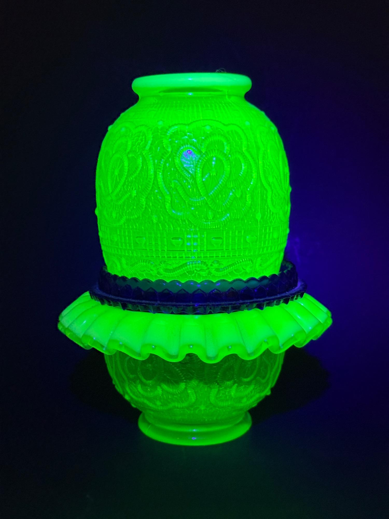 This elegant uranium glass set, also known as Vaseline glass, emits a vibrant green glow under ultraviolet (black) light. Featuring intricate embossed patterns and a combination of smooth and ruffled edges, this set includes multiple pieces that can be stacked or displayed separately. Likely produced in the late 19th to early 20th century, this set exemplifies the craftsmanship of the Victorian and Art Nouveau eras. Key Features: Material: Uranium/Vaseline glass with a signature fluorescent glow under UV light. Design: Intricate embossed patterns with a ruffled glass trim and a deep cobalt blue accent piece. Components: Three-piece stackable set, including a base, a ruffled bowl, and a matching shade. Color: Vivid green under UV light; soft green under natural lighting. Era: Late 19th to early 20th century, reflecting vintage glass artistry. Dimensions: Total Height: 6.5” Top Piece (Shade): 3.25” H x 3.5” W Middle Piece (Ruffled Bowl): 5” W x 2.5” H (Uranium Glass) Base (Cobalt Dish): 4.25” W x 1.85” H Condition: Well-preserved with no visible cracks or chips.
