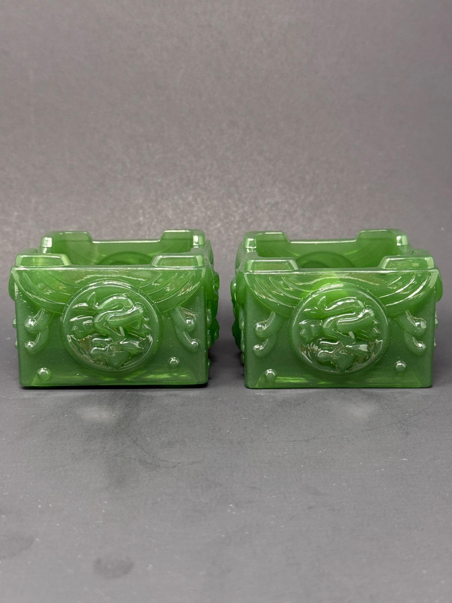A beautiful pair of Imperial Glass-Ohio "Cathay Jade" candle holders in rich dark jadeite glass. This design was produced between 1980-1981 before being discontinued. Each holder features a raised dragon medallion motif with ornate detailing, inspired by Asian artistry. The square shape with open sides and a central candle insert makes these a striking addition to any vintage or jadeite collection. Features: Imperial Glass-Ohio "Cathay Jade" pattern (Dark Jade) Rich green jadeite glass with a glossy, semi-translucent finish Intricate embossed dragon medallion and decorative elements Original Imperial Lenox stickers intact Size: Approx. 3.25" x 3.25" each Discontinued pattern (1980-1981) Condition: no visible chips or cracks. The stickers confirm your pieces were indeed made by Imperial Glass Company after it was acquired by Lenox in 1981. Here’s the timeline that explains it: Imperial Glass Company operated independently from 1901 until it closed in 1984. In 1981, Lenox Inc. purchased Imperial, and during that brief period, some Imperial glassware was produced under the branding "Imperial – Hand Crafted Glass by Lenox." These pieces retained Imperial molds, designs, and colors (like jadeite slag glass), but were marketed with Lenox branding.