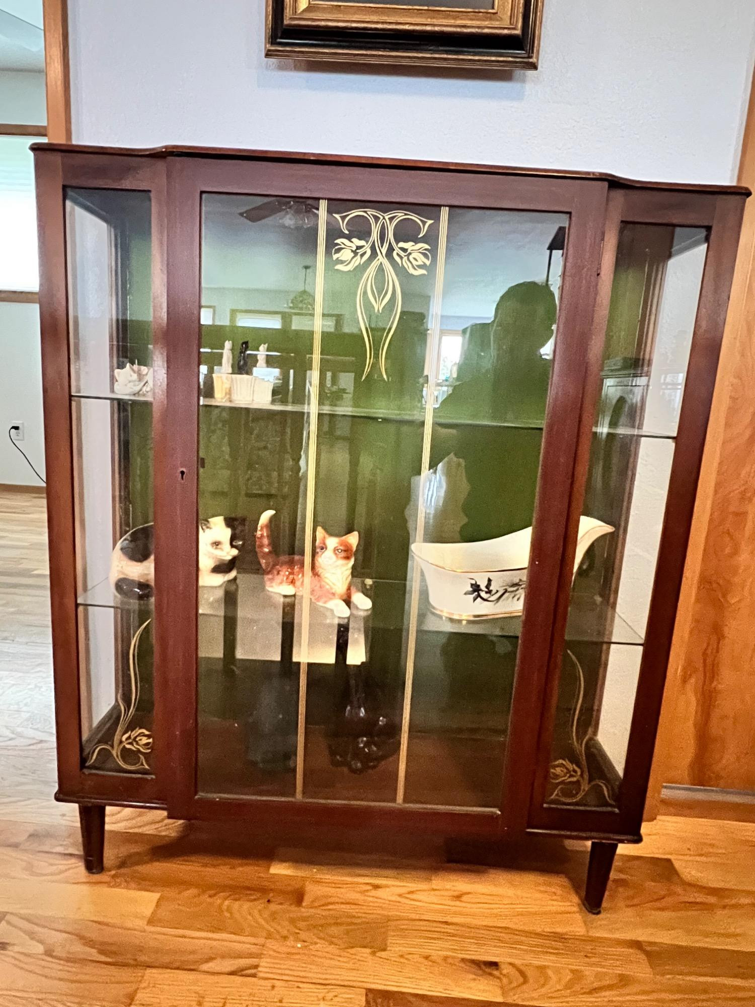 This timeless vintage wooden display case features a sturdy frame with a warm brown finish, accented by clear glass panels on the front and sides. Elegant gold etching decorates the glass, showcasing intricate floral and scrollwork patterns for a refined touch. Its gently curved frame reflects a subtle Art Nouveau influence or early 20th-century design, making it a sophisticated addition to any space. Items in cabinet are NOT included. Features: Sturdy wooden frame with a warm brown finish Glass front and side panels for full visibility Ornate gold etching with floral and scroll motifs Glass shelves for organized display Dimensions: 36" W x 10.5" D x 42" H Condition: Minor wear on wood, structurally sound. Glass panels and etching intact. (See photos.)