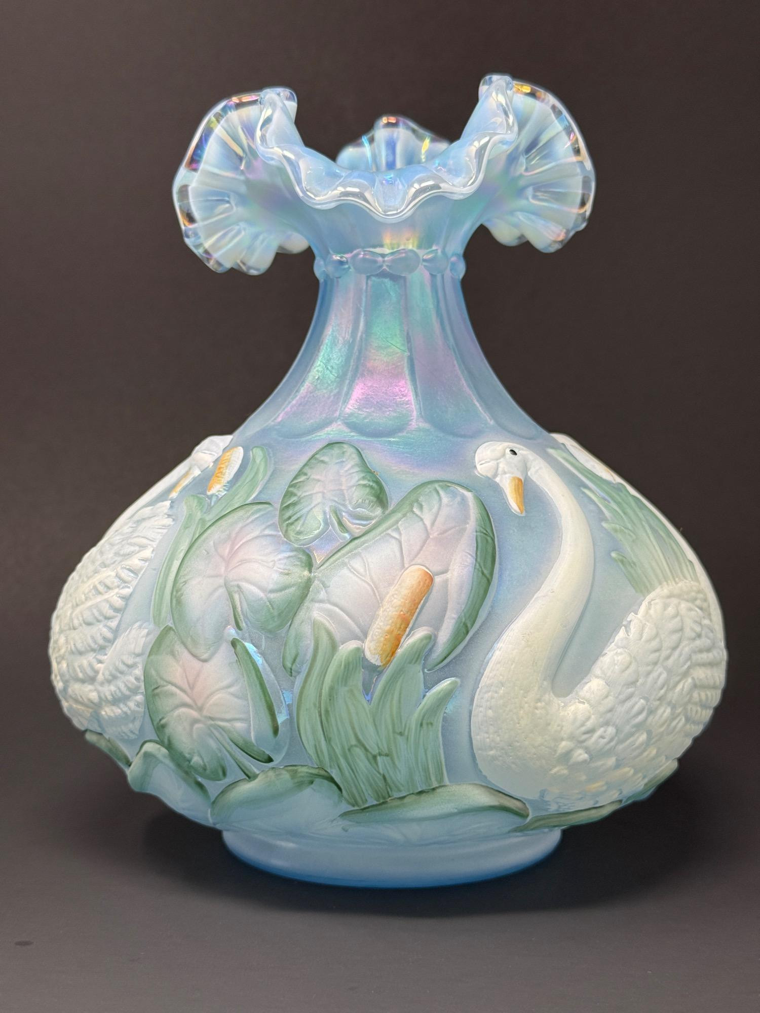 Fenton "Swan in Cattails" Vase in Blue Iridized Satin Glass This exquisite Fenton Art Glass vase features a breathtaking blue opalescent finish with a hand-painted swan and lily pond design. The iridescent sheen enhances the intricate raised detailing of the swans, lily pads, and cattails, creating a serene and elegant aesthetic. The vase is further adorned with a delicately ruffled rim, adding to its charm. Hand-painted by C.A. Hall and signed by Frank M. Fenton, this piece showcases the craftsmanship and artistry that Fenton is known for. A Fenton sticker confirms its authenticity. Features: Blue opalescent iridescent glass with a soft shimmering effect Raised swan and lily pond design, hand-painted with intricate details Ruffled top edge, adding elegance to the classic vase shape Signed by Frank M. Fenton and hand-painted by C.A. Hall Authentic Fenton sticker, verifying its origin Dimensions: 7.25” H x 7” W (widest point) Condition: Well-preserved with no structural damage.