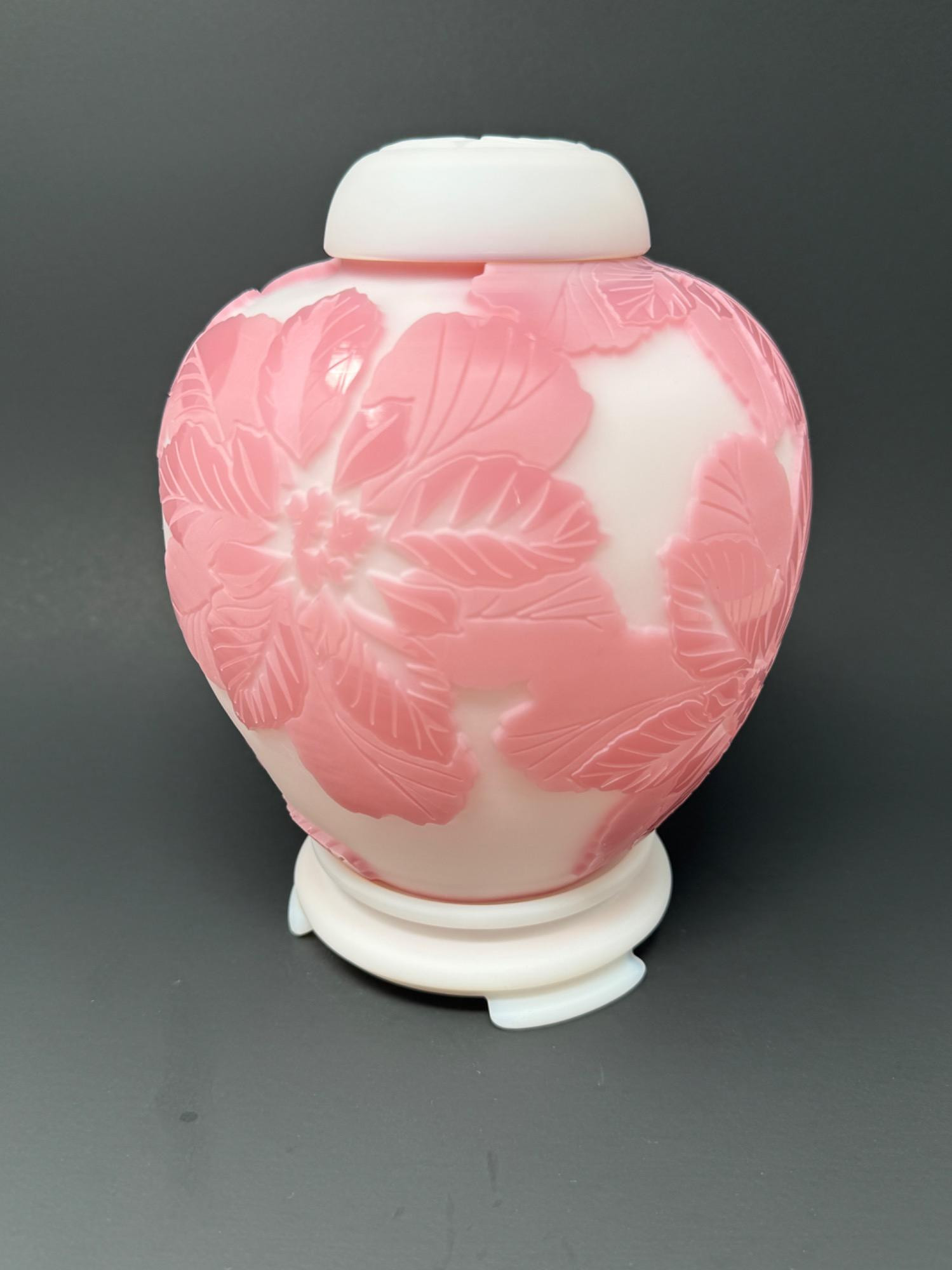 This is a Fenton "Poinsettias" Ginger Jar from the 2007 Studio Collection, designed by cameo glass artists Kelsey Murphy and Robert Bomkamp. The piece is mouth-blown in the USA and features a sand-carved poinsettia designon Rosalene glass, a unique formula that uses pure gold to achieve its delicate pink blush when reheated. Features: Handcrafted Fenton Art Glass Rosalene glass with an intricate sand-carved poinsettia design Signed by artists Kelsey Murphy and Robert Bomkamp Limited edition: Numbered 145 out of 450 Comes with a matching lid and a white glass base Mouth-blown and hand-carved in the USA Dimensions: Without lid: Approximately 6.5 inches tall x 6.25 inches wide With lid: Approximately 7 inches tall x 6.25 inches wide With base: 8 inches tall Base dimensions: 1.25 inches tall x 4.25 inches wide Condition: Well-preserved with no chips, cracks, or repairs.