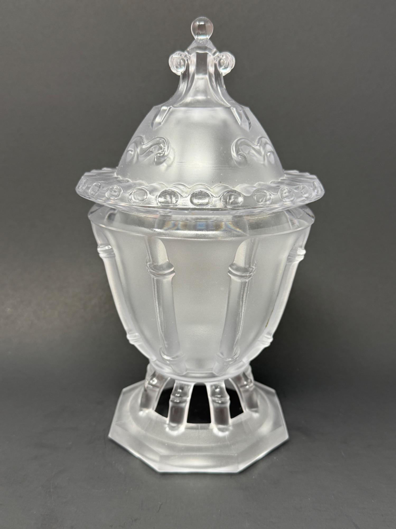 This elegant vintage Imperial Glass Cathay Crystal candy jar dates back to the 1940s and was designed by renowned artist Virginia B. Evans. The jar features a frosted glass finish with a distinctive bamboo-inspired motif, an octagonal footed base, and an ornate lid with a decorative finial. Part of the Imperial Glass Cathay line (No. 5014), this piece is a rare and highly collectible example of mid-century American glass artistry. Features: