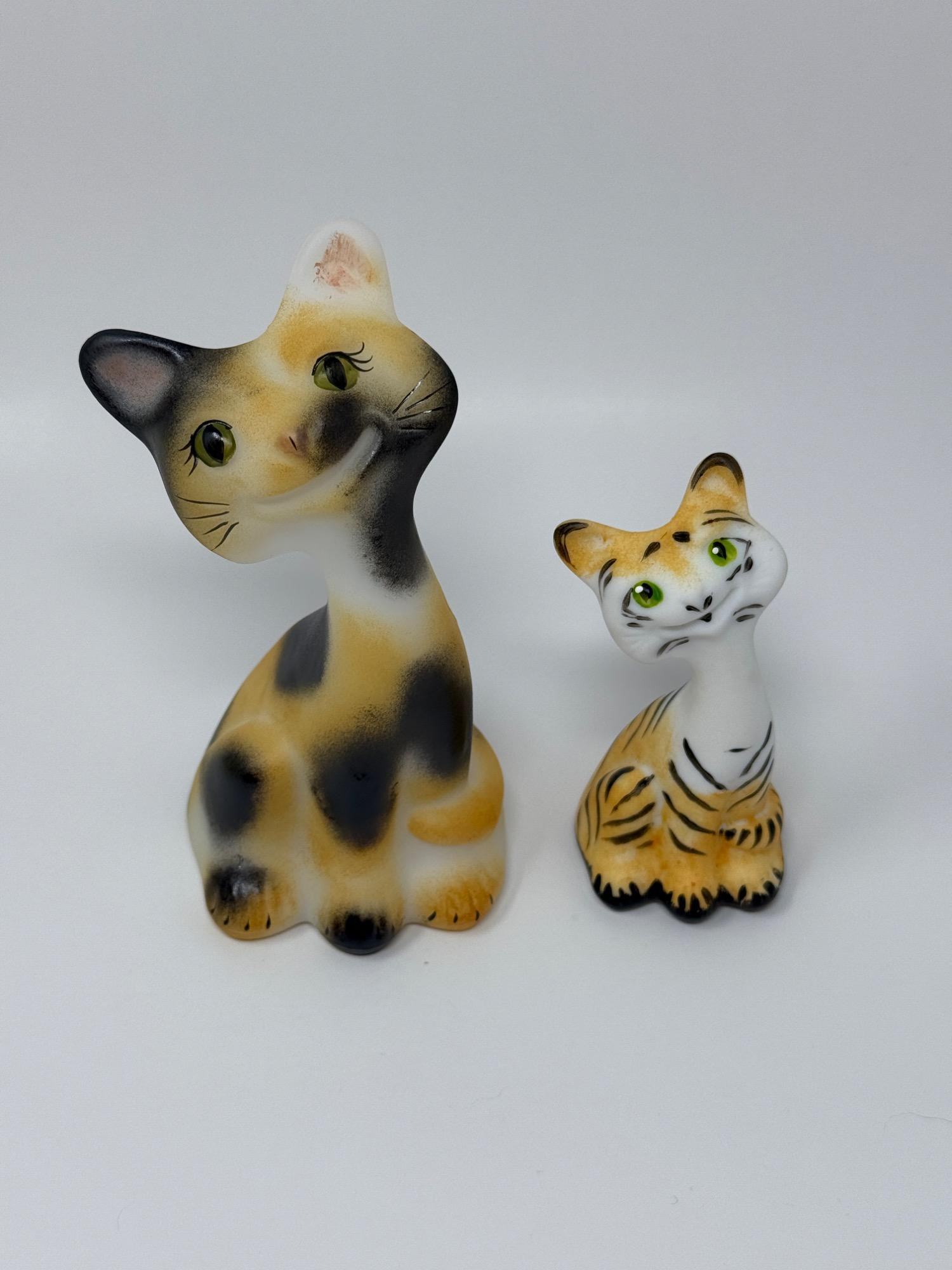 This beautiful pair of hand-painted Fenton glass cat figurines features expressive faces, elongated necks, and stunning airbrushed detailing in a gold, black, and white color scheme. Each figurine is meticulously hand-painted and signed by artists Xuming Yuan and Martha Reynolds, ensuring their uniqueness. They also bear Fenton’s original "Hand-painted in USA" sticker and the FAGCA-TM marking, possibly indicating a special or limited edition. Features: Size: 6 inches (larger cat) & 4 inches (smaller cat) Condition: no chips, cracks, or repairs.