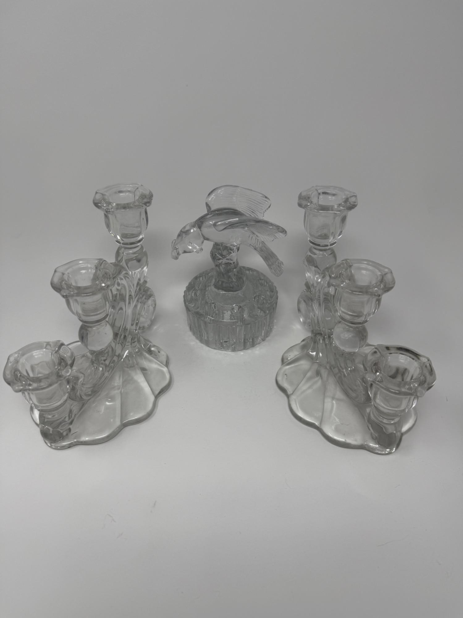 Lot # 53 - Vintage Cambridge Glass 6-Candle Holder Set & Bird Flower Frog