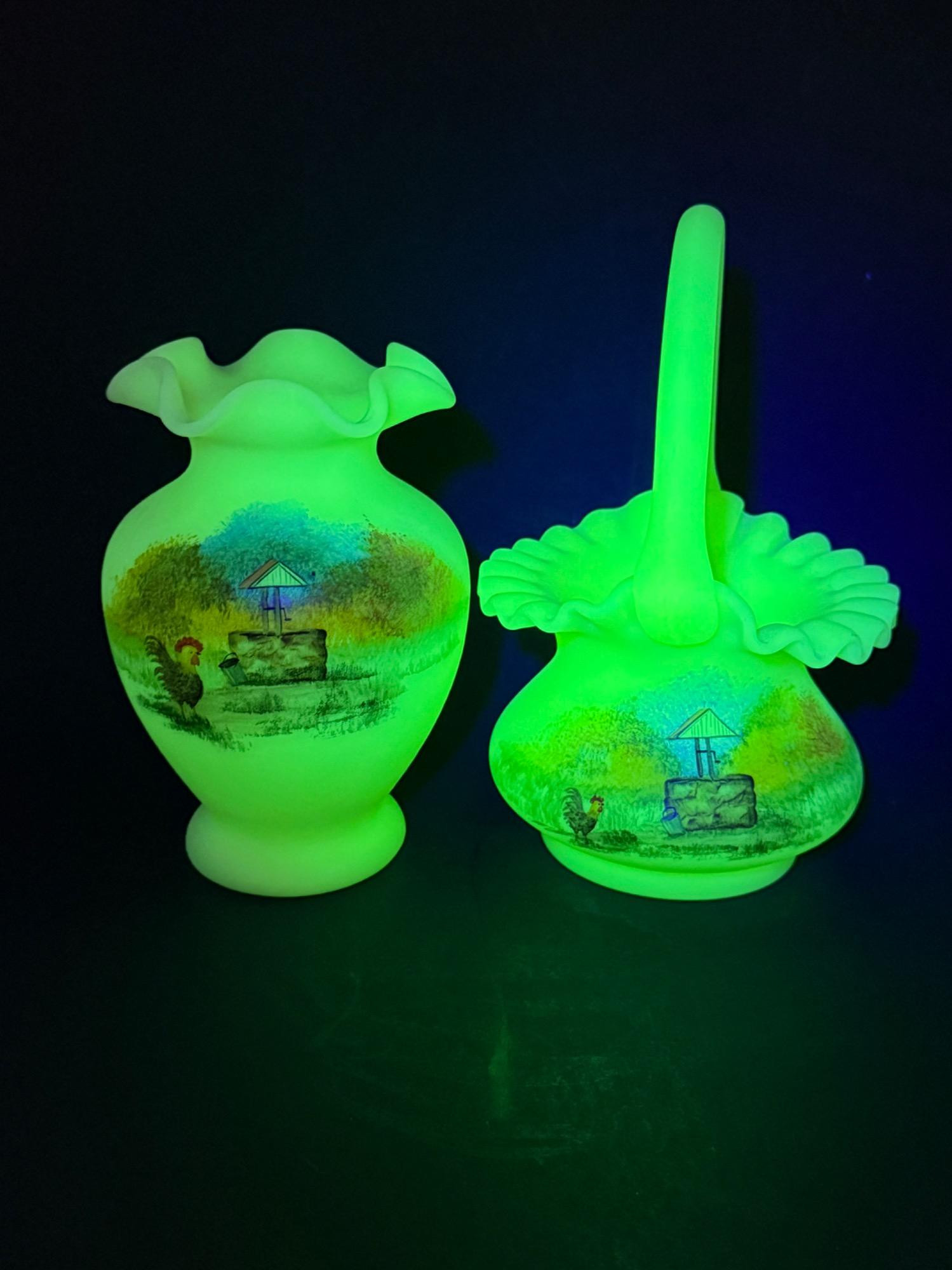 Lot # 63 - Fenton Uranium Glass Vase & Basket – Hand-Painted by Dane Fredrick