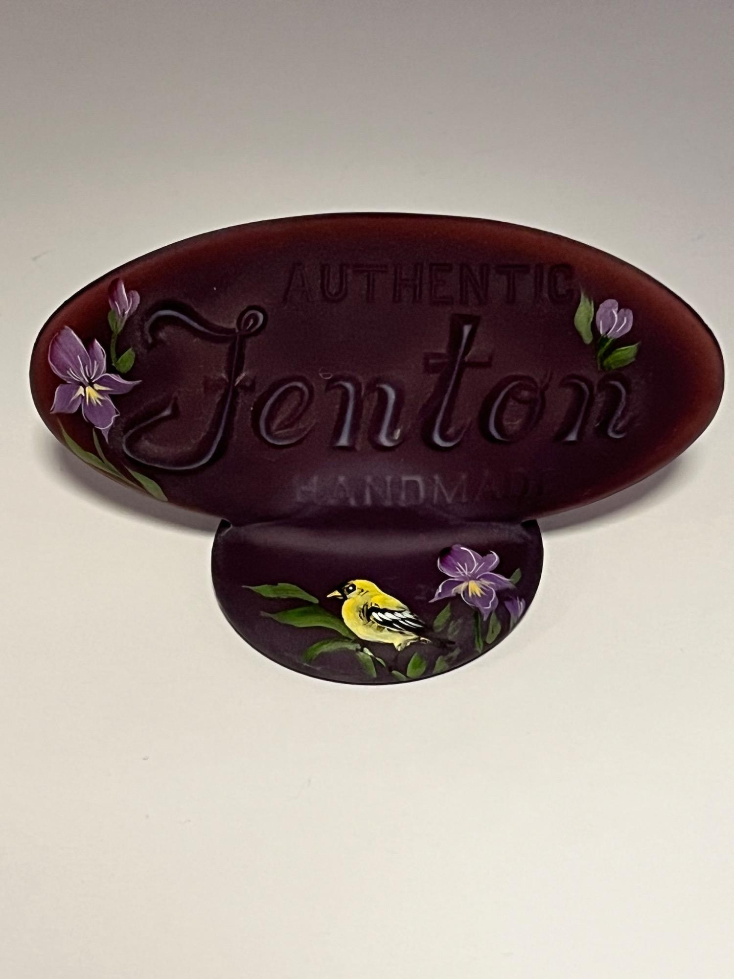 This is a Fenton Art Glass Handmade Eggplant Purple Logo Display Sign from the Family Signature Series. It features a deep eggplant-purple glass body with hand-painted floral designs and a small bird. The "Fenton Handmade"logo is embossed on the front. Key Details: Limited Edition: This is #53 of 68, as marked on the bottom. Signed: The piece is signed by M. Kibbe (2022). Size: 5"W x 3"D x 3"H. Hand-Painted: Features delicate purple flowers and a yellow bird.