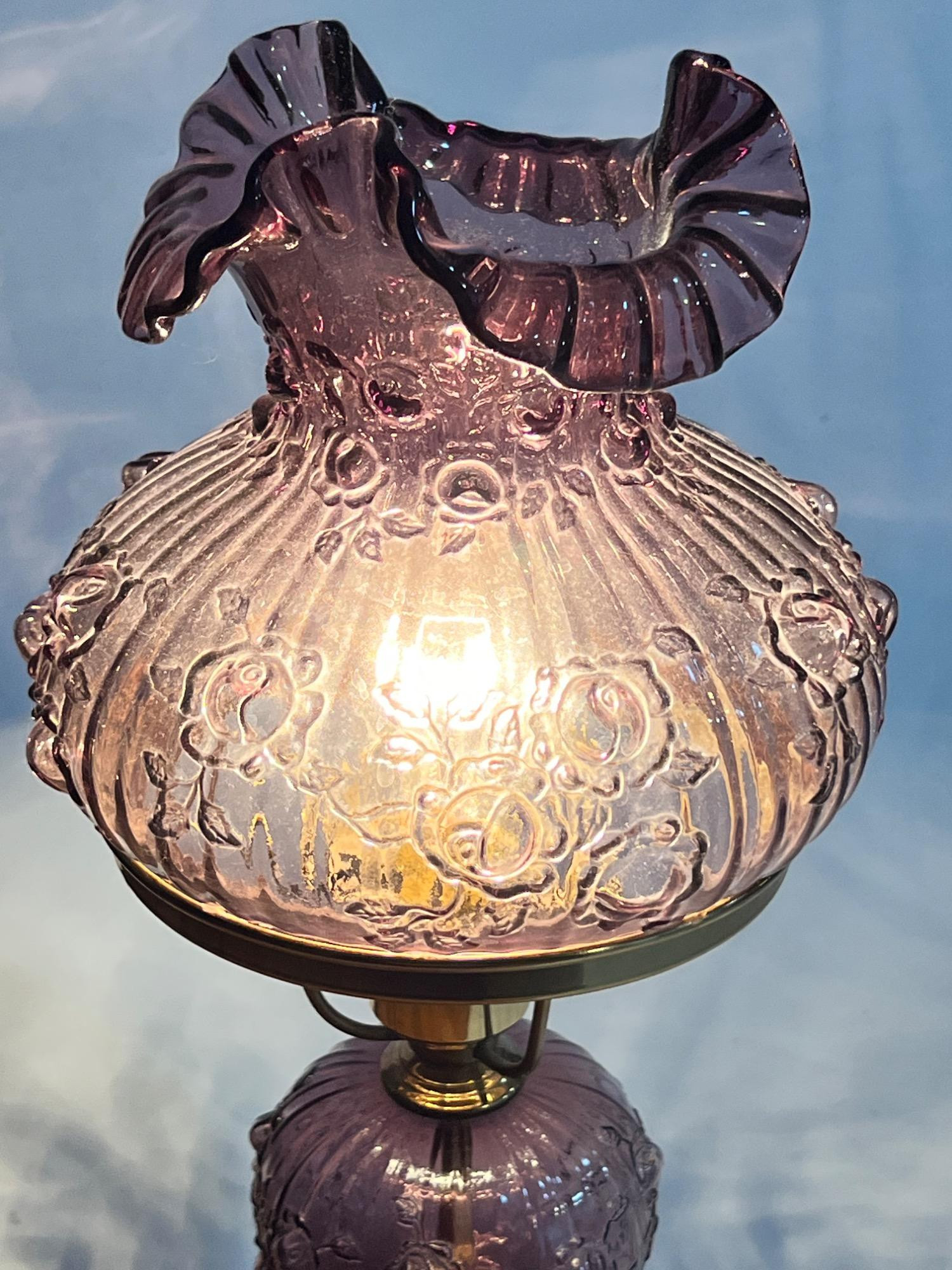 Authentic Fenton GWTW lamp – Rare Amethyst Cabbage Rose design