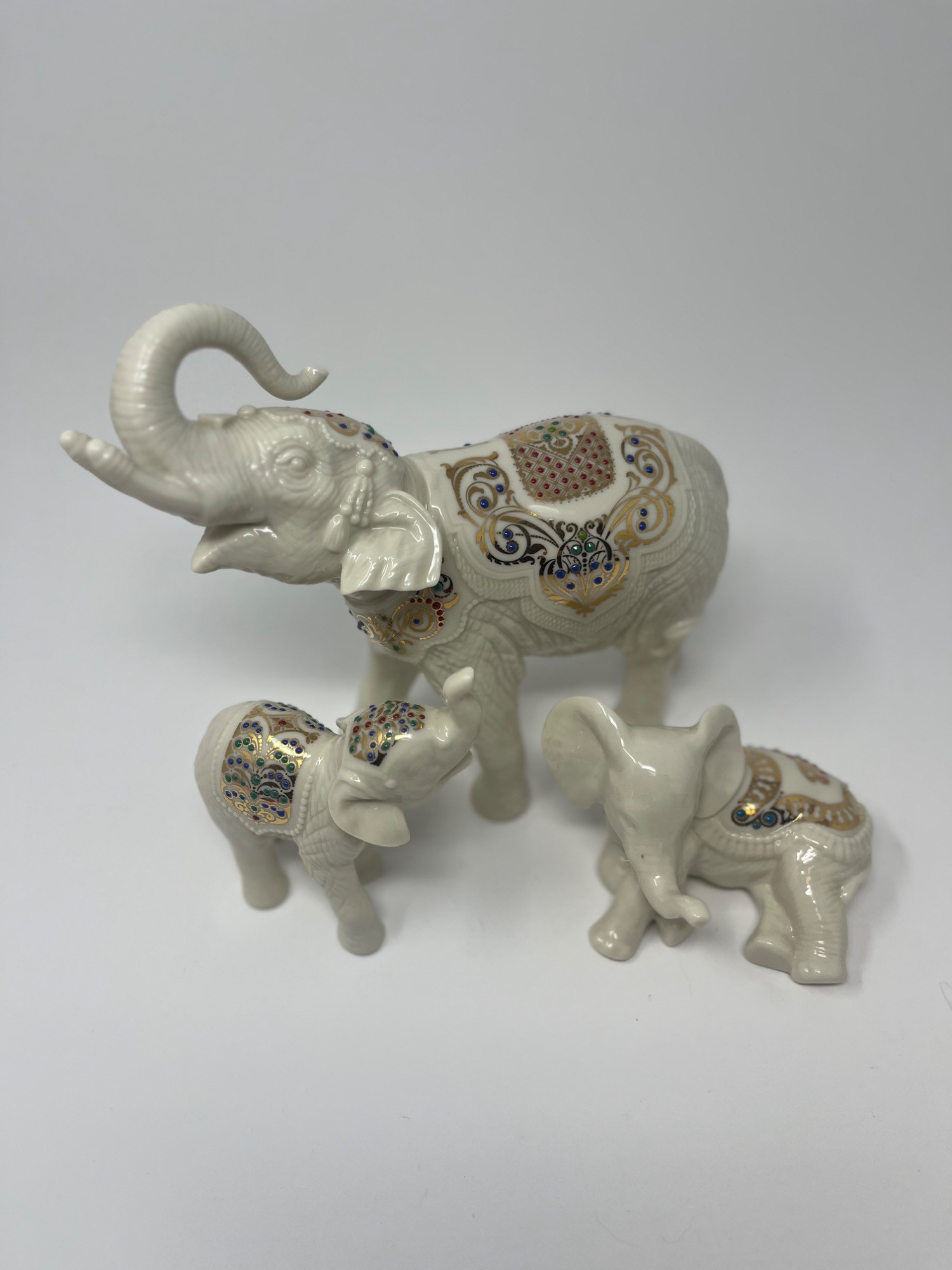 This stunning set of three Lenox China Jewels Collection elephant figurines is a must-have for collectors and décor enthusiasts. Crafted in 1993, these exquisite porcelain elephants are adorned with gold detailing and jewel-like accents, reflecting the timeless elegance of Lenox craftsmanship. Each figurine is uniquely posed, making this a perfect trio for display. Features: Dimensions: Tall Elephant: 8” Tall x 9” Wide Laying Elephant: 3” Tall x 5” Wide Little Elephant (Calf): 4.5” Tall x 4.5” Wide