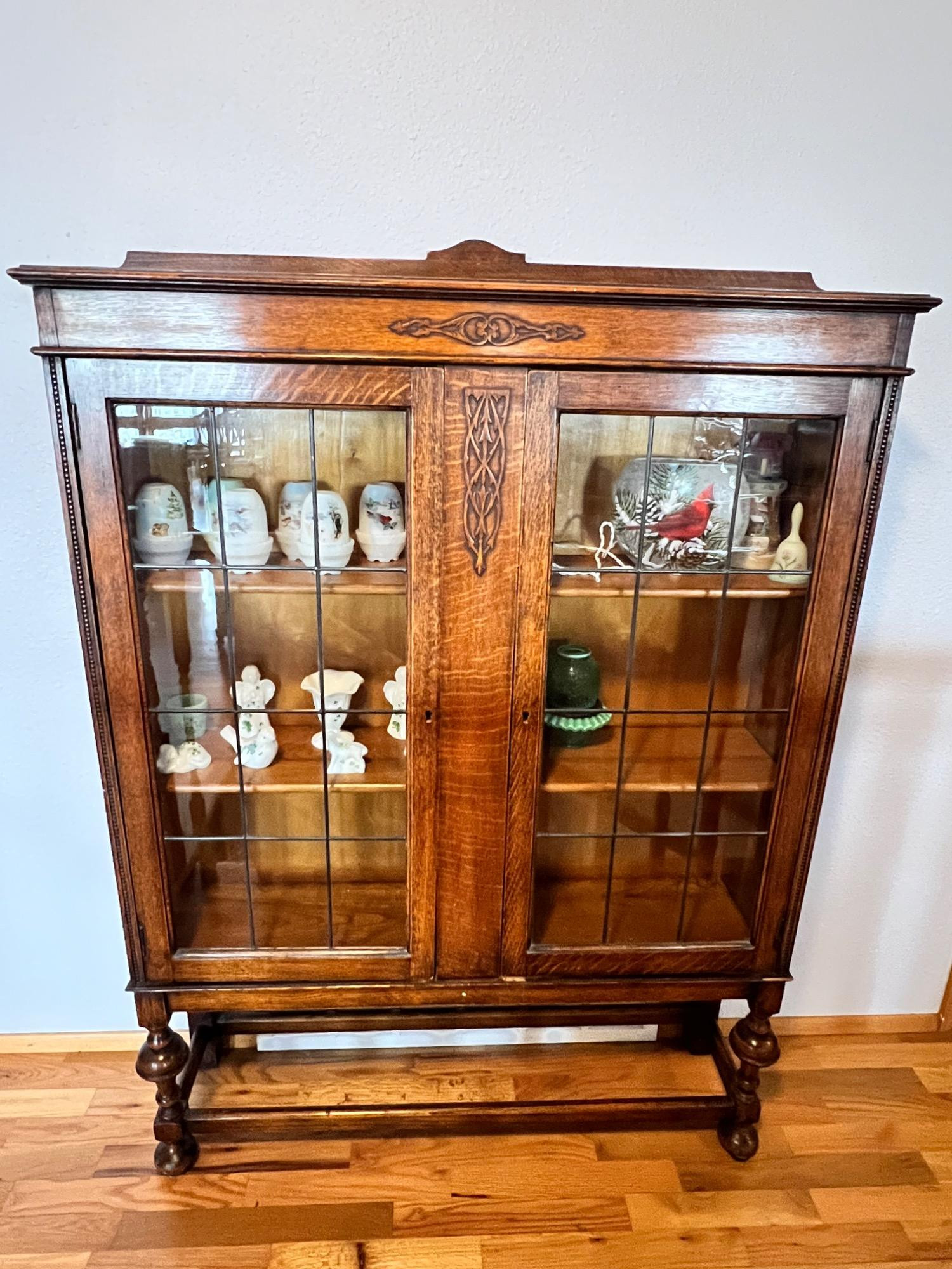 Elegant vintage wooden display cabinet with intricate carvings and leaded glass doors. Perfect for showcasing collectibles, china, or décor. Sturdy and timeless design. Features: Solid wood with a rich finish Glass-paneled doors with leaded design Ornate carved details Sturdy turned legs Includes key for secure access Three interior shelves Dimensions: 55” H × 40.5” W × 10.5” D Condition Glass and wood intact, some wear