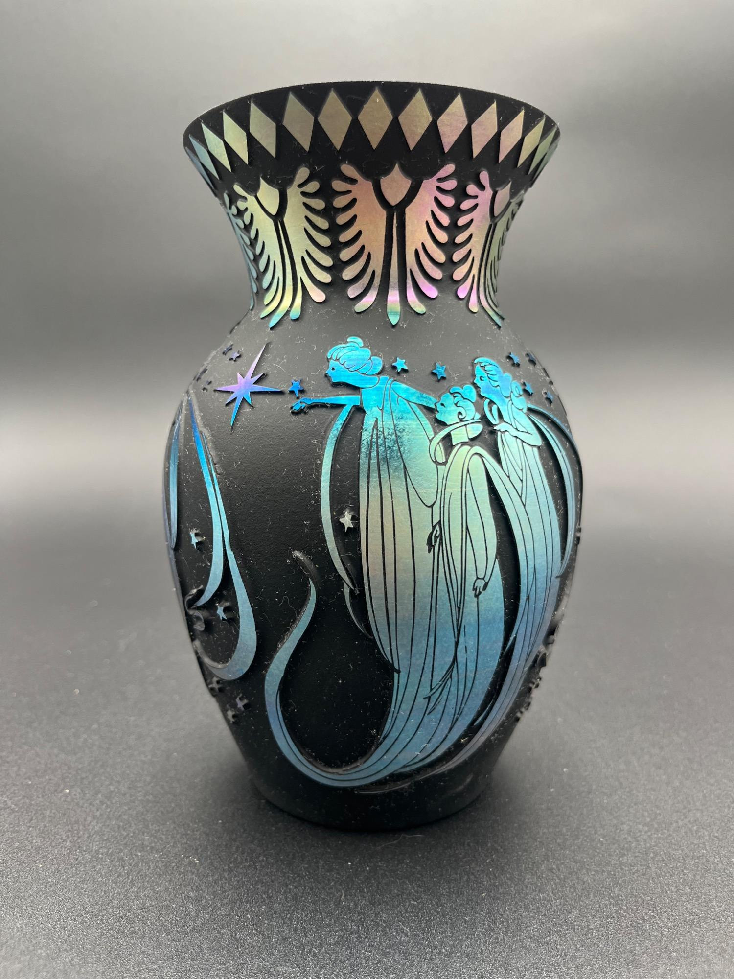 This stunning Fenton Art Glass "Angel Tryptic" Vase is a breathtaking example of cameo glass artistry, handcrafted by renowned artists Kelsey Murphy and Robert Bomkamp. This limited edition piece (#35 of 350) is a true collector’s item, featuring delicate angelic figures set against a celestial night sky. Key Features: Handmade Fenton Glass - Expertly crafted in the USA Signed by Artists - Kelsey Murphy & Robert Bomkamp Limited Edition - Only 350 pieces produced Intricate Cameo Carving - Depicting elegant angelic figures in flowing gowns Stunning Satin Finish - Features an iridescent sheen with blue and purple highlights Measurements - 7.5 inches tall, 5 inches wide Original Fenton Sticker & Care Instructions Included