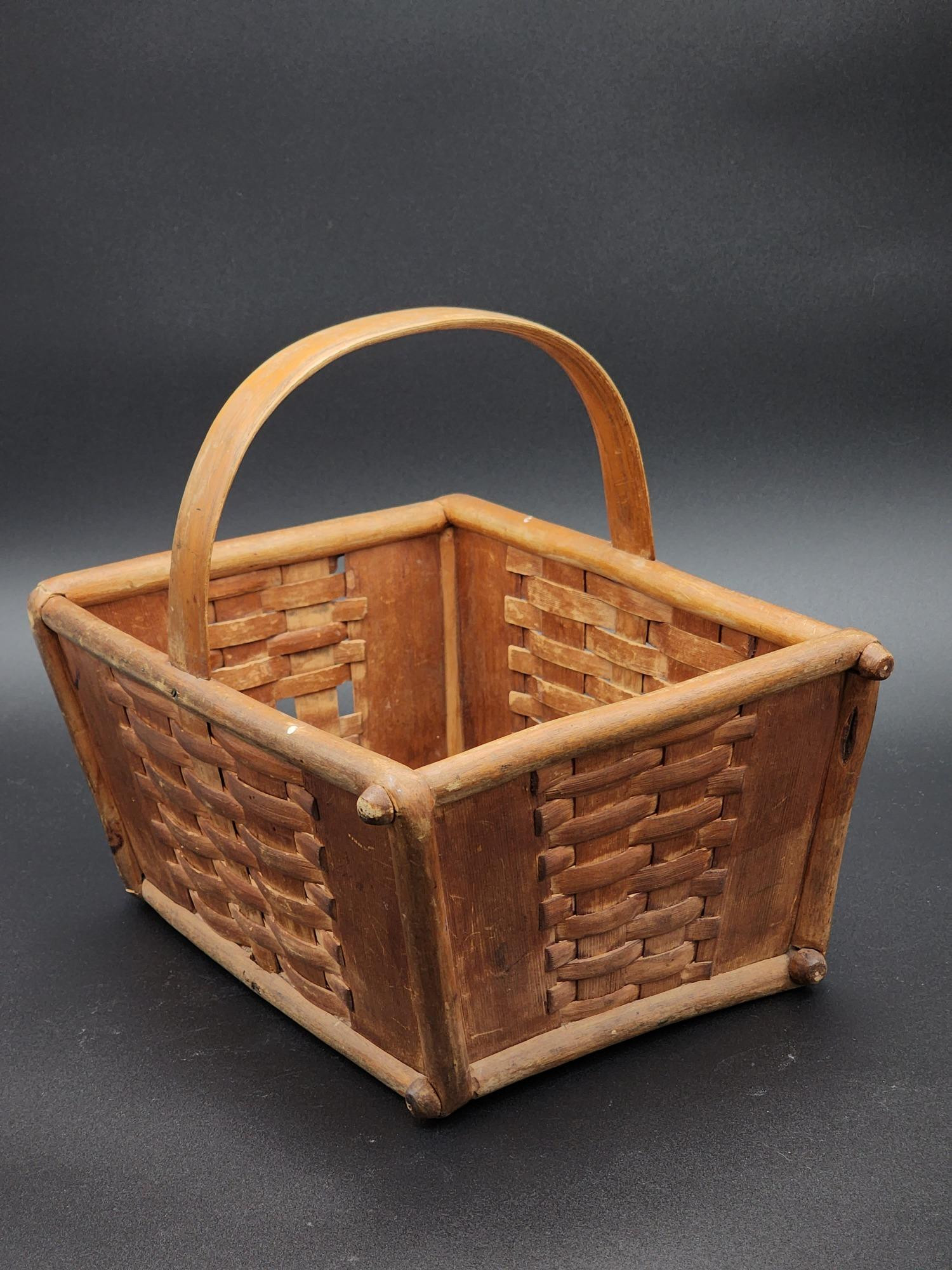 Description: Details: Material: Natural wood Construction: Woven wood slats with round-corner wooden frame Handle: Fixed bentwood handle Dimensions: 18 1/2" long, 14" wide, and 17" high overall. Basket is 9 1/4" high at side. Style: Rustic / Primitive / Country Condition: Good vintage condition with age-appropriate wear; shows some scuffs, patina, and minor imperfections consistent with age and use