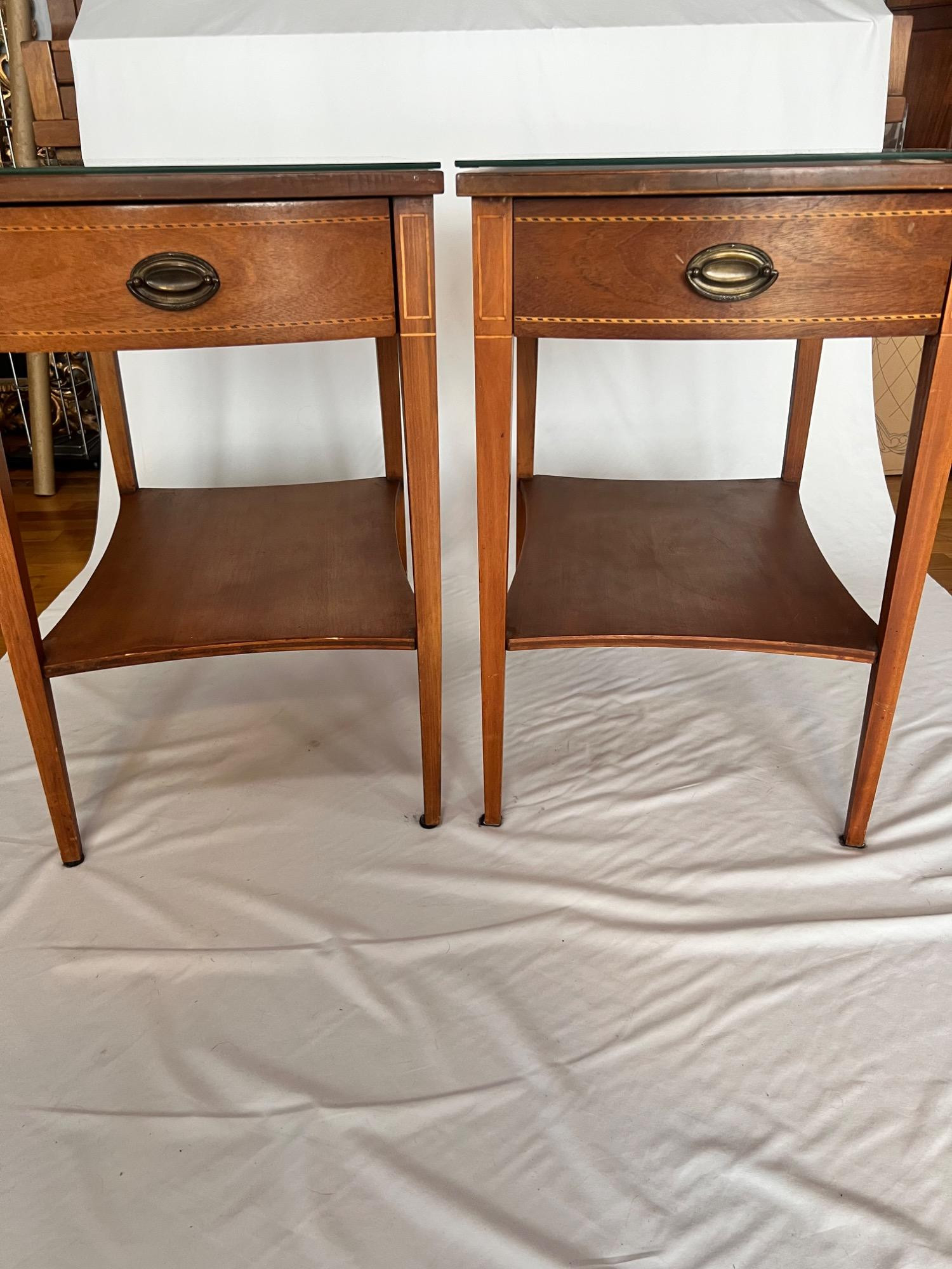 This matching pair of vintage wooden side tables showcases beautiful inlaid wood detailing and timeless craftsmanship. Each table features a single drawer with an ornate brass oval pull, plus a lower shelf for additional storage or display. Dimensions (each table): Height: 24 3/8" Depth: 23 3/8" Width: 16" Features: Traditional craftsmanship with fine inlay accents Rich wood tones with a warm patina Classic brass hardware Lower shelf for added utility Glass top (optional to mention if included) Perfect for use as nightstands, end tables, or accent pieces in any classic, traditional, or transitional interior. Condition: Gently used vintage condition with minor surface wear consistent with age.