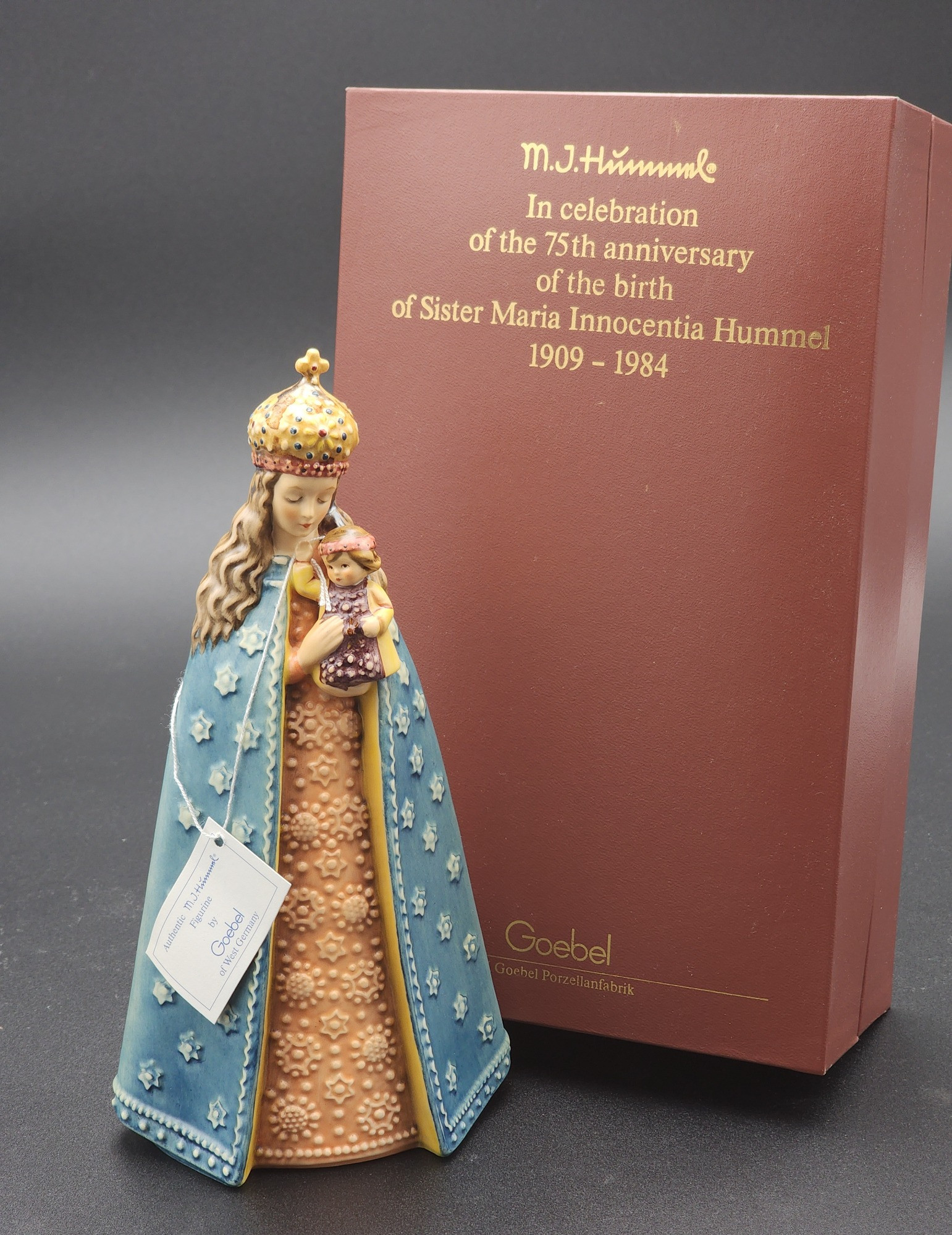 Goebel M.I. Hummel "Madonna and Child" 75th Anniversary Commemorative Figurine with Box Celebrate a milestone in Hummel history with this exquisite Goebel M.I. Hummel figurine, produced in honor of the 75th anniversary of the birth of Sister Maria Innocentia Hummel (1909–1984). This limited-edition piece features the Madonna tenderly holding the Christ Child, beautifully detailed with rich colors, gold accents, and a flowing blue cloak adorned with stars. Maker: Goebel, West Germany Markings: Stamped on base; reads “In Celebration of the 75th Anniversary of the Birth of Sister M.I. Hummel 1909–1984” Dimensions: Approximately 9" tall x 4" wide Condition: no chips or cracks with original commemorative box and tag included