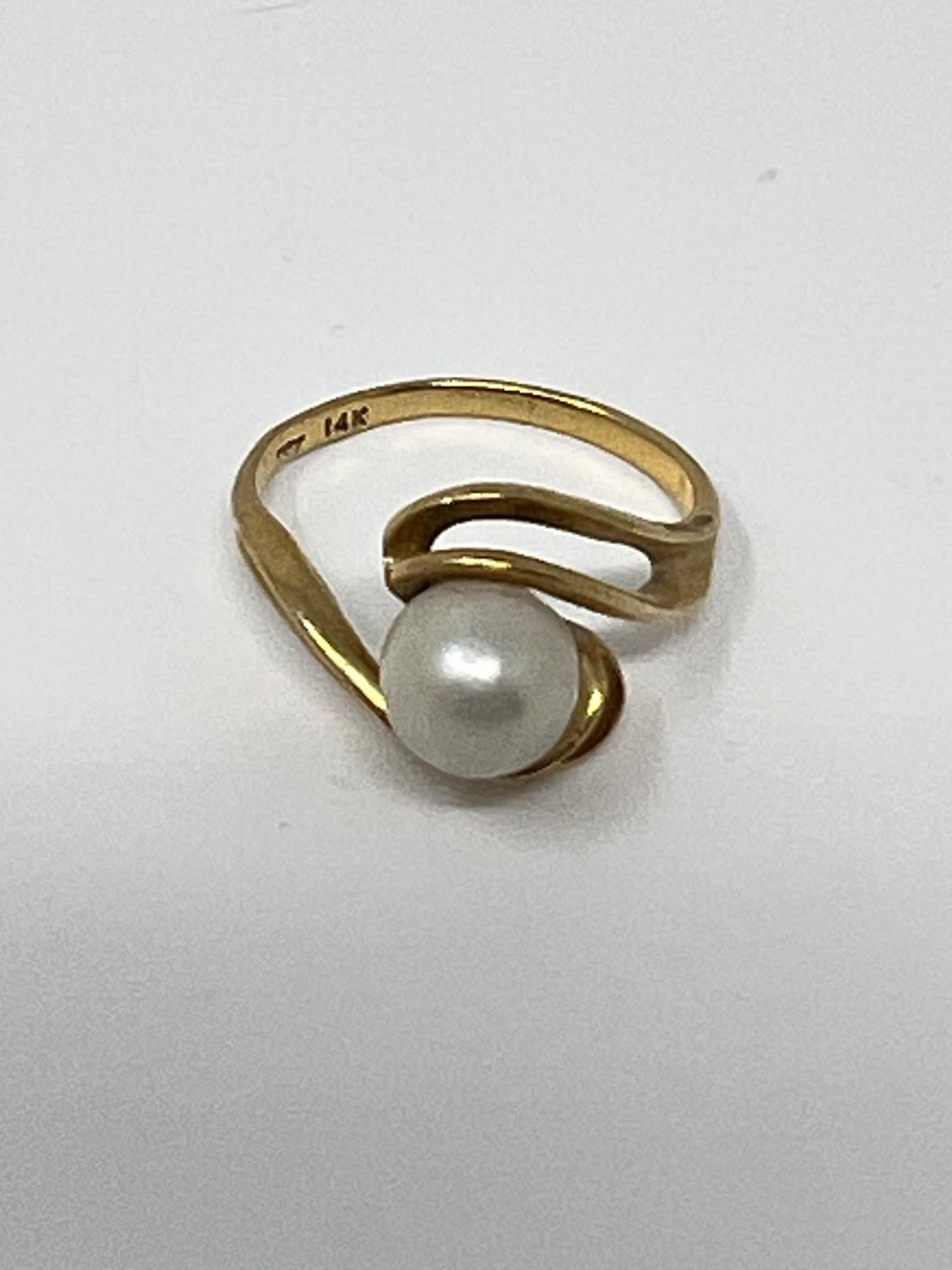Touch of timeless elegance for your collection with this beautifully crafted vintage ring. Made of solid 14K yellow gold, this piece features a lustrous white pearl set in a unique modernist swirl design. The ring is marked "14K" on the inner band, confirming its gold purity. Metal: Solid 14K Yellow Gold Stone: White Pearl (approx. 7–8mm) Size: US 6 Style: Vintage / Modernist Condition: Excellent vintage condition with minor signs of wear consistent with age.