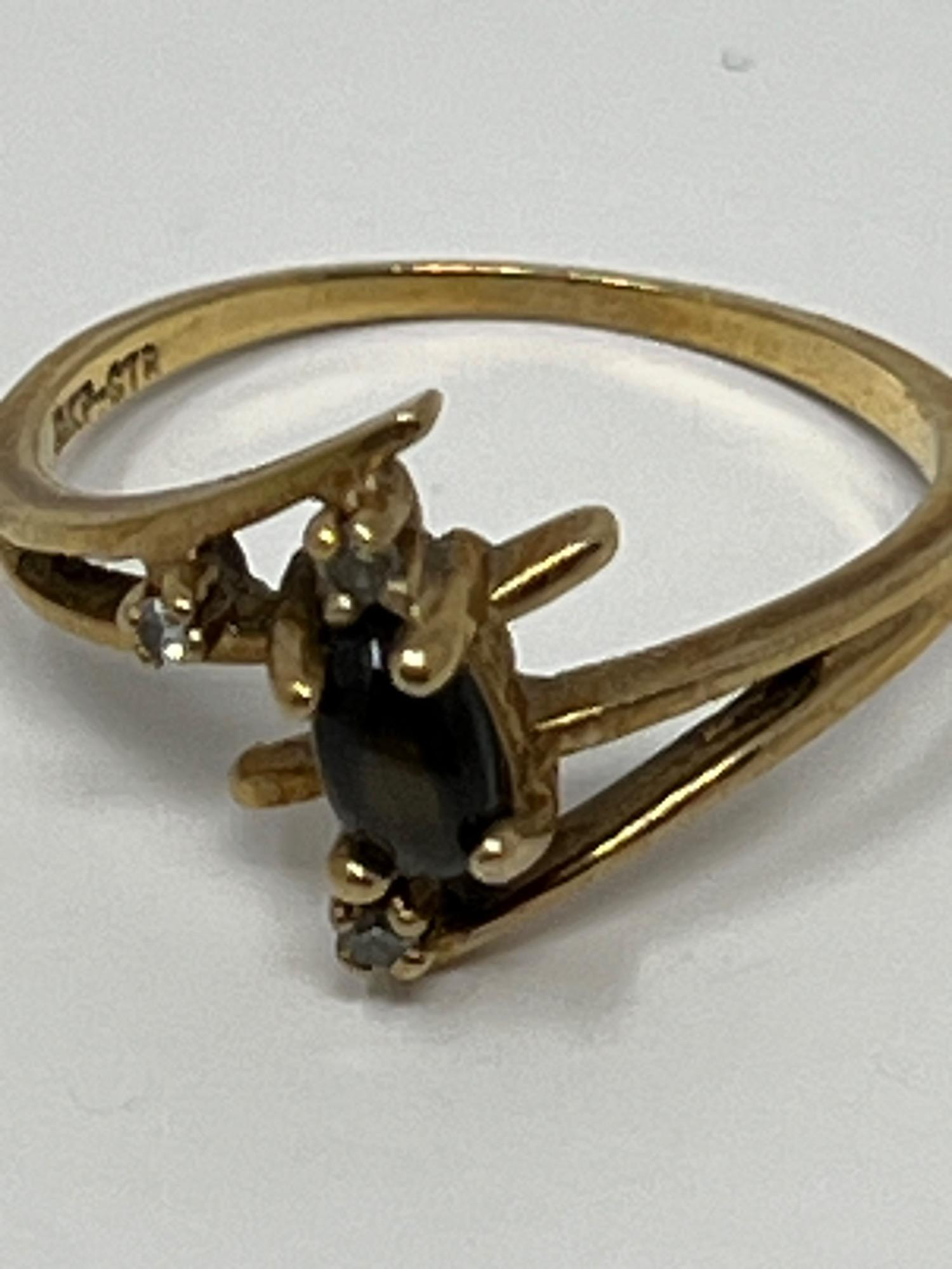 This elegant vintage 10K yellow gold ring features a marquise-cut black onyx center stone, gracefully flanked by two sparkling diamond accents. The unique split shank design adds a modern flair to a timeless piece. Material: 10K Yellow Gold (Stamped "10K - GTR") Gemstones: One marquise-cut black onyx Two small round diamond accents Ring Size: US 6.5 Condition: Pre-owned, in very good condition with minimal signs of wear
