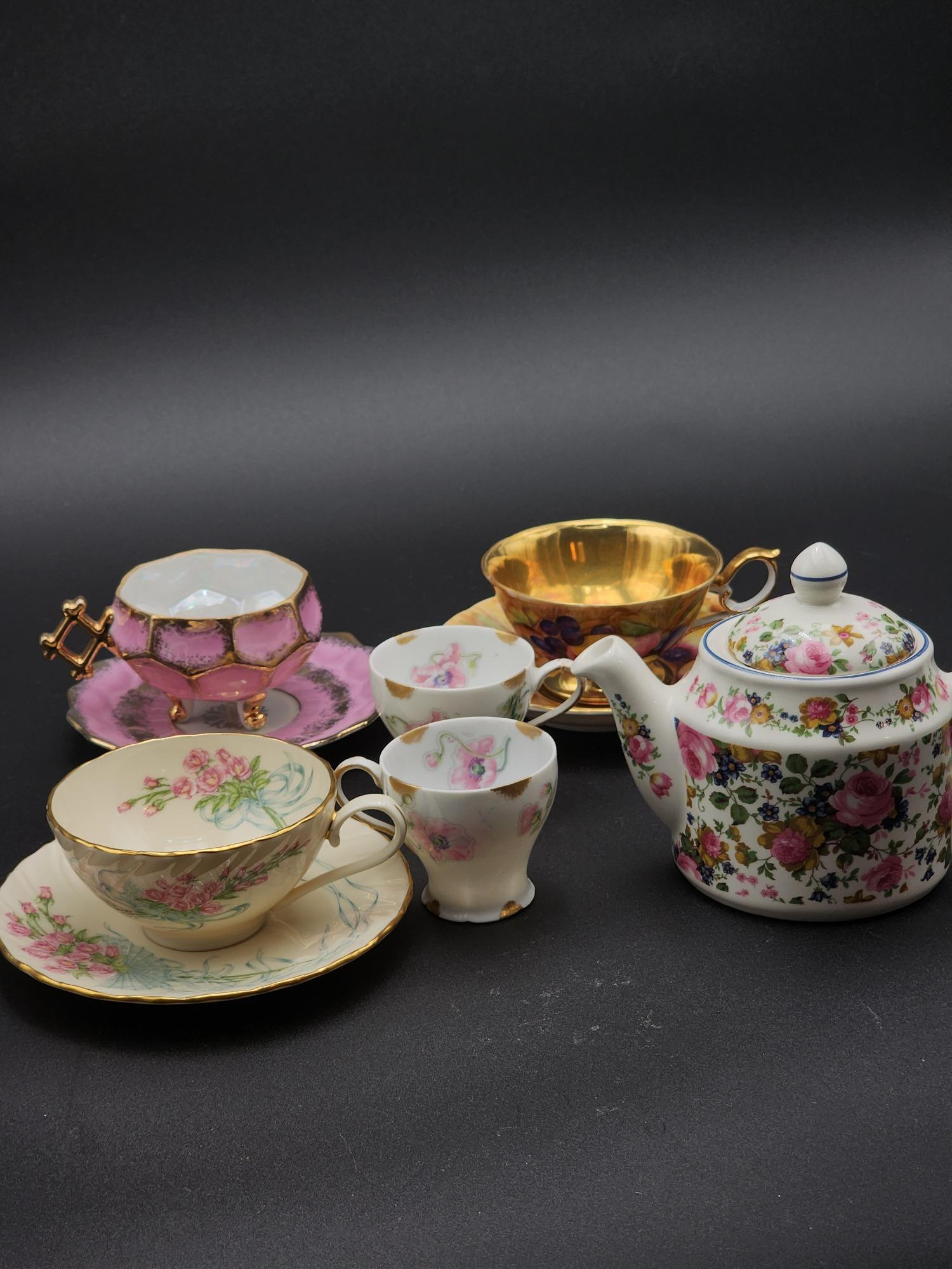 Timeless elegance shines through this stunning vintage teacup and teapot collection, beautifully adorned with floral motifs, gold accents, and hand-painted detailing. Included in this set: 1 floral teapot with matching lid (multi-color rose pattern) 6 assorted teacups and saucers: Each piece is unique – some may show signs of age like light wear or slight fading, adding to their vintage charm.