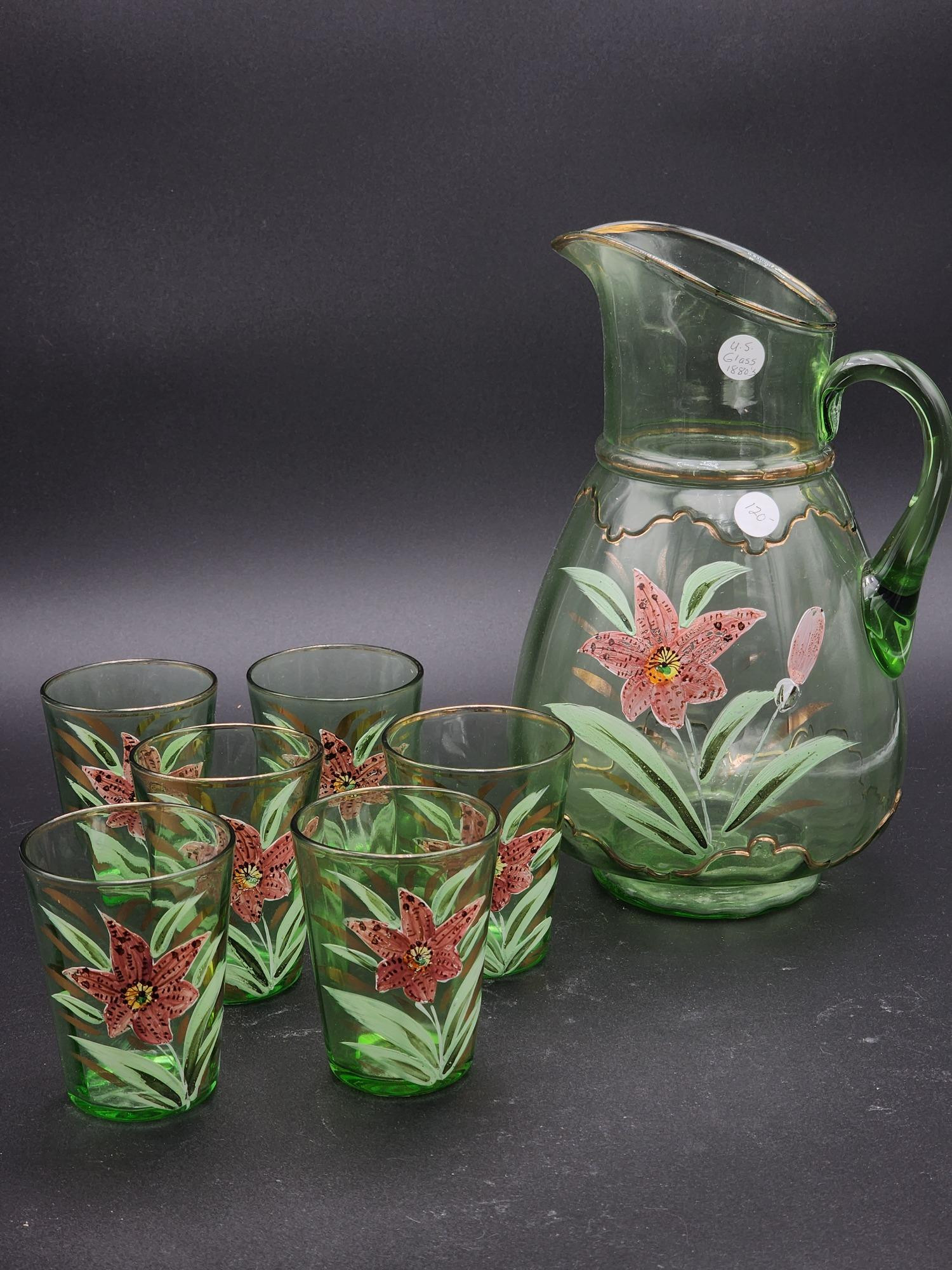 Lot # 126 - Antique 1880s Hand-Painted Green Glass Set with 6 Tumblers