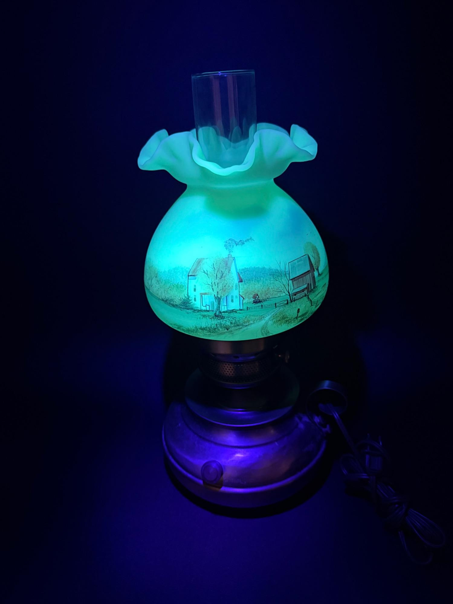 Lot # 131 - Signed Fenton Uranium Glass Lamp – Hand Painted by Dane Frederick