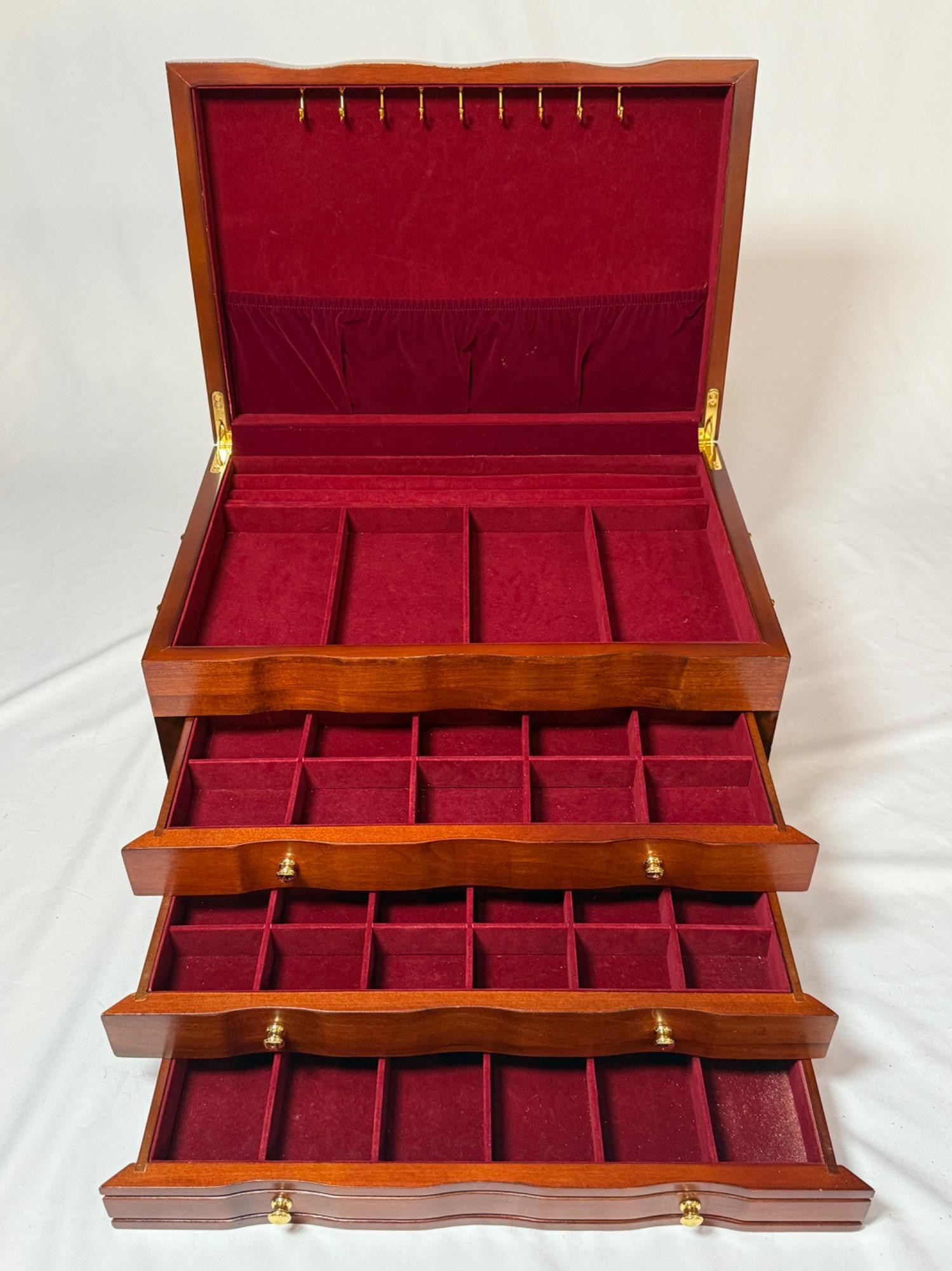 Keep your treasured jewelry organized and protected with this elegant vintage wooden jewelry box. Crafted from solid wood with a polished finish, this classic piece features three spacious drawers and a top compartment, all lined with luxurious red velvet to keep your valuables safe and scratch-free. Key Features: Dimensions: 11.5" x 17" x 9.25" Condition: Pre-owned in good condition – Shows minor signs of wear, including slight surface scratches and some interior lint, but overall well-maintained and fully functional.