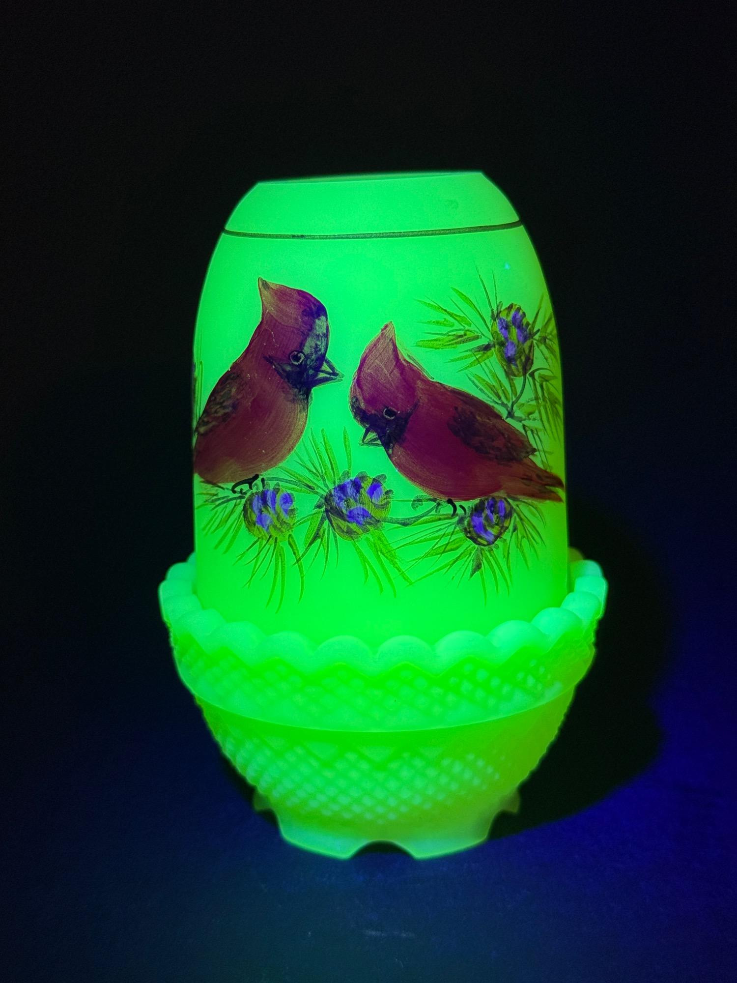This piece features a beautifully hand-painted design of cardinals perched among pine branches and cones. When viewed under blacklight, the glass glows a vibrant neon green—confirming its uranium content and making it a true collector’s delight. Maker: Art Glass Material: Custard Uranium Glass Design: Hobnail base with scalloped rim Glow: Stunning green under UV light Approx. 5.5" tall Note: There is a small inner rim chip (see photo).