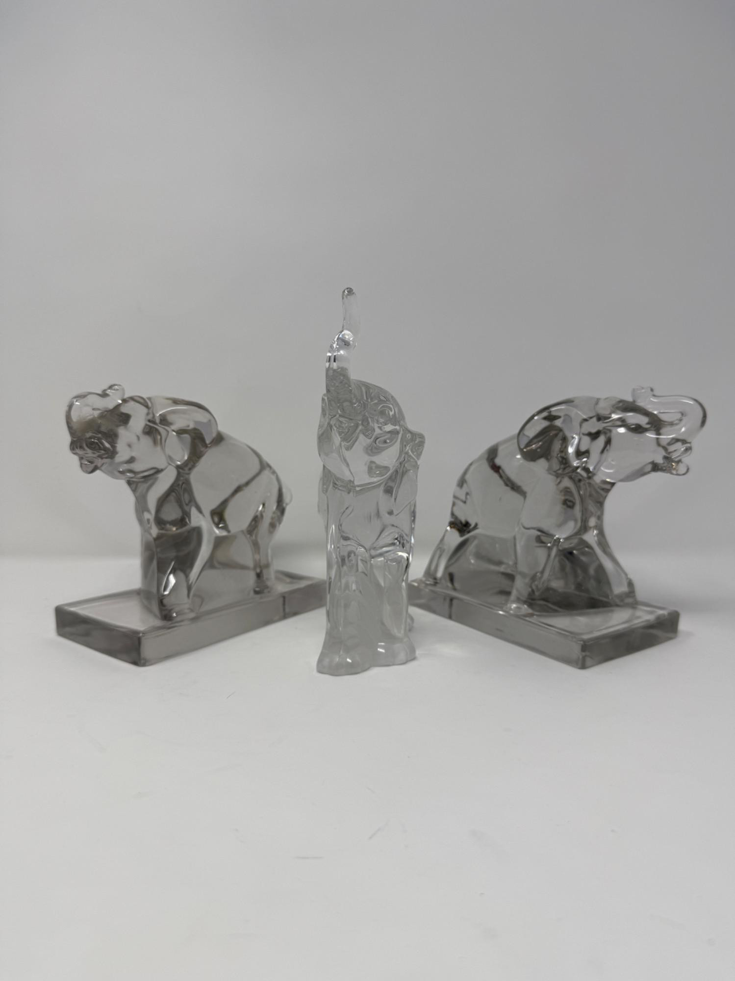 3 Set of Glass Elephants Clear Glass Elephant Figurine on Base – Art Glass, Possibly Lalique or Daum Style This stunning clear glass elephant figurine features a graceful, stylized form with its trunk raised in a symbol of good luck. Mounted on a rectangular base, the piece showcases fine craftsmanship and a modern design. While unmarked, it closely resembles the work of high-end makers such as Lalique, Daum, or Kosta Boda. Material: Clear glass (possibly crystal) Design: Stylized elephant with trunk raised Base: Rectangular platform Condition: Excellent – no chips, cracks, or repairs Dimensions: Approx. Elephants with rectangular base is 3.1" x 5.25" Base. Height is 5.25" Maker: Unmarked – in the style of Lalique or Daum Clear Glass Elephant Figurine – Raised Trunk, Leafy Base – Mikasa Style This charming clear glass elephant figurine features a raised trunk (a symbol of good luck) and is standing over a detailed leafy base. The smooth contours and clear finish make it a standout piece for any animal figurine or glass art collection. While unmarked, it is in the style of Mikasa or vintage pressed glass from the late 20th century. Material: Pressed clear glass (possibly crystal) Design: Elephant with raised trunk and molded leaf base Maker: Unmarked – in the style of Mikasa or Crystal D’Arques Condition: Excellent – no chips, cracks, or repairs Dimensions: Approx. 6.75" tall x 6.25 Wide x 2"