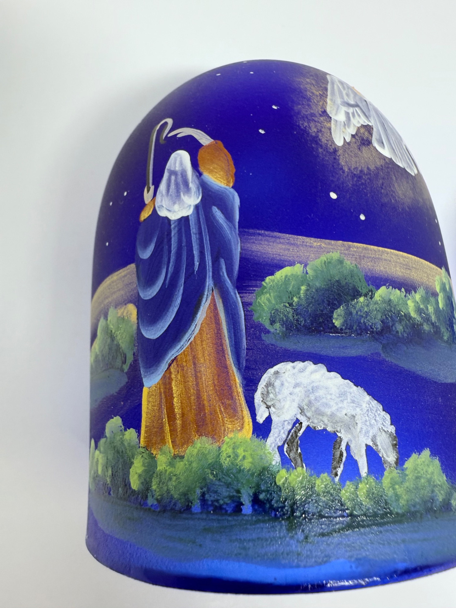 This cobalt blue Fenton fairy lamp is a beautifully hand-painted art glass piece signed by Janet Dowler, a known Fenton artist. The lamp showcases a peaceful nativity scene featuring a shepherd, lambs, and an angel beneath a starlit sky, all delicately rendered in fine detail. Color: Deep cobalt blue Material: Satin-finished art glass Design: Textured hobnail base with scalloped rim Scene: Serene pastoral/nativity setting with sheep, trees, and celestial accents Artist Signature: "Hand-painted by J. Dowler" Brand: Fenton Art Glass Condition: Excellent – no chips, cracks, or repairs Dimensions: 4.5" Height x 3.5" Width