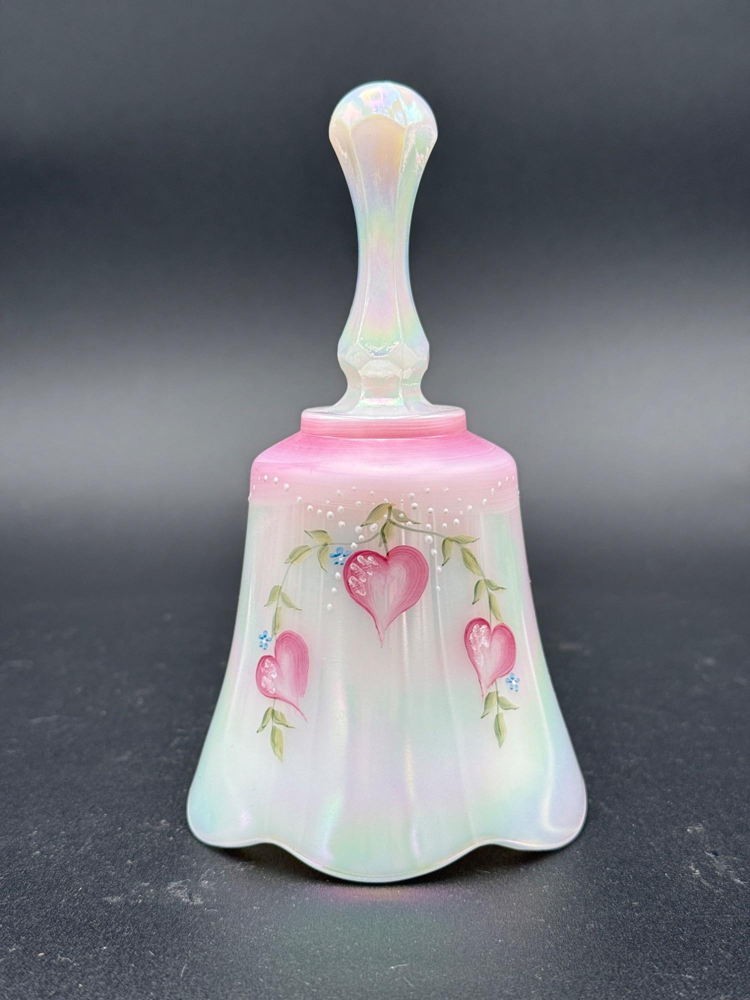 This beautiful Fenton Art Glass bell stands 6.25 inches tall and features an opalescent satin finish with a soft pink fade near the top. It is hand-painted with a bleeding heart floral design in shades of pink and green, accented by tiny blue blossoms and delicate white enamel dotting. Crafted in the USA, it retains its original Fenton “Hand Painted” and “Handmade in USA” labels and is artist-signed by D. Robinson (1993) on the inside rim. Dimensions: 6.25" tall, base is 3.5" wide Condition: no chips or cracks