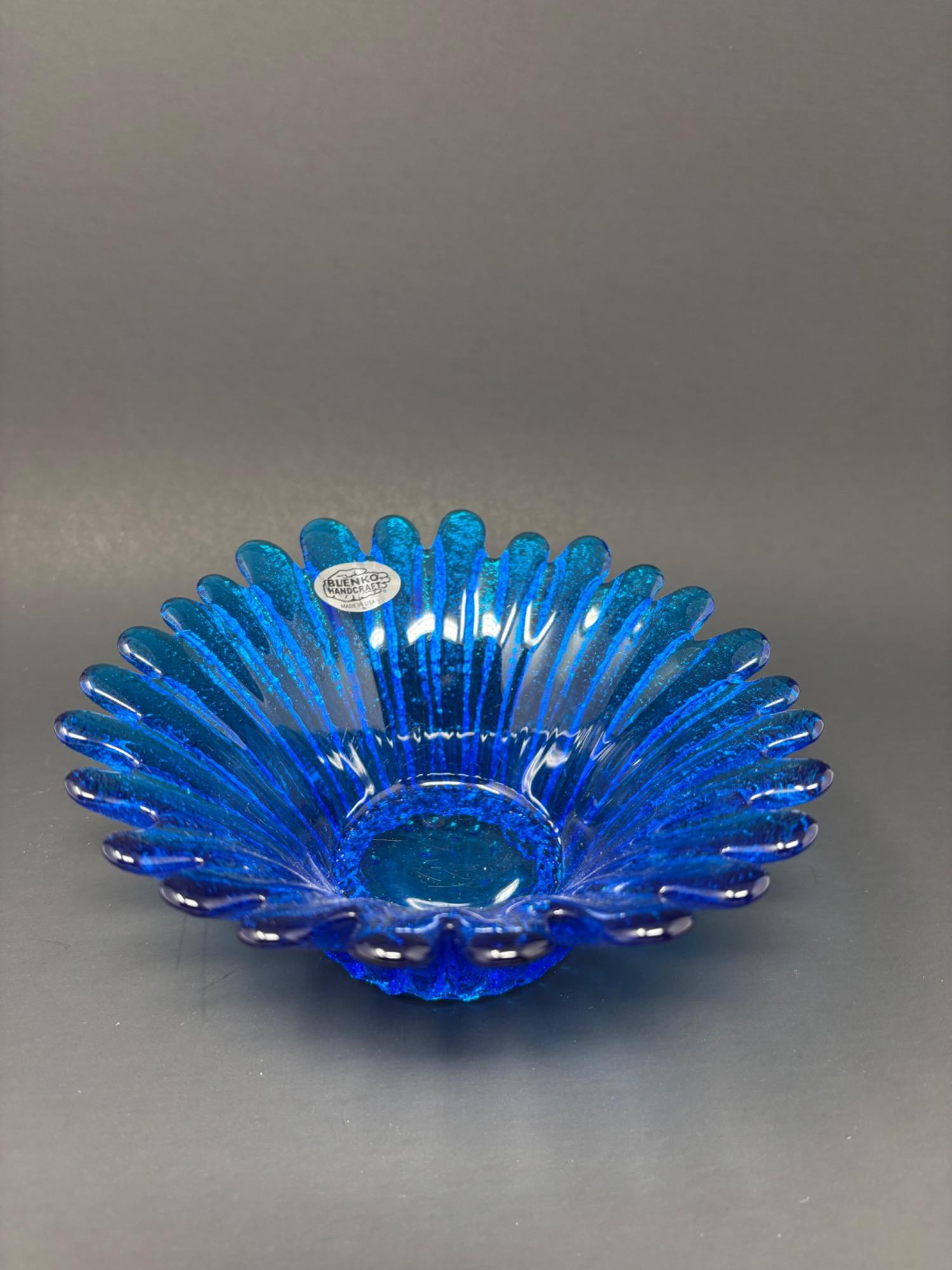 This stunning Blenko Handcraft Cobalt Blue Art Glass Bowl is a striking example of mid-century American glass artistry. Made in the USA, the piece features a deep, vibrant blue with a shimmering, textured finish. The dramatic ruffled fan-shaped edge and hand-pulled ridges create a floral-like silhouette that’s both artistic and functional. This handcrafted bowl showcases Blenko's iconic design language, celebrated for its bold color and organic form. It retains the original “Blenko Handcraft – Made in USA” foil label, confirming its authenticity. Features: Color: Rich cobalt blue Material: Hand-blown art glass Maker: Blenko Handcraft (with label) Style: Mid-century modern Origin: USA Dimensions: Approx. 7" x 6.75" wide, 2.75" high
