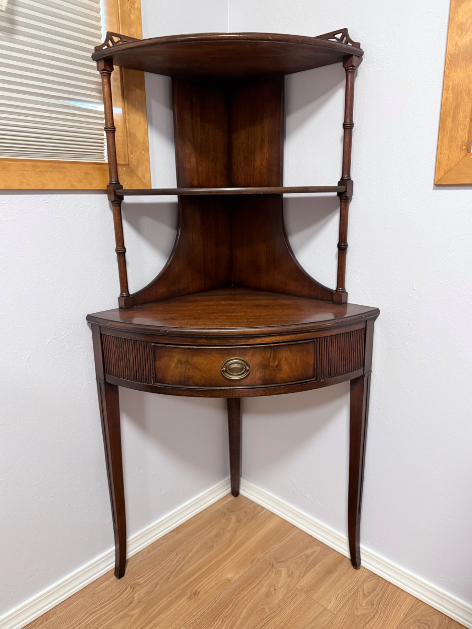 Lot # 166 - Vintage 1940s Mahogany 3-Tier Corner Shelf Table w/ Drawer