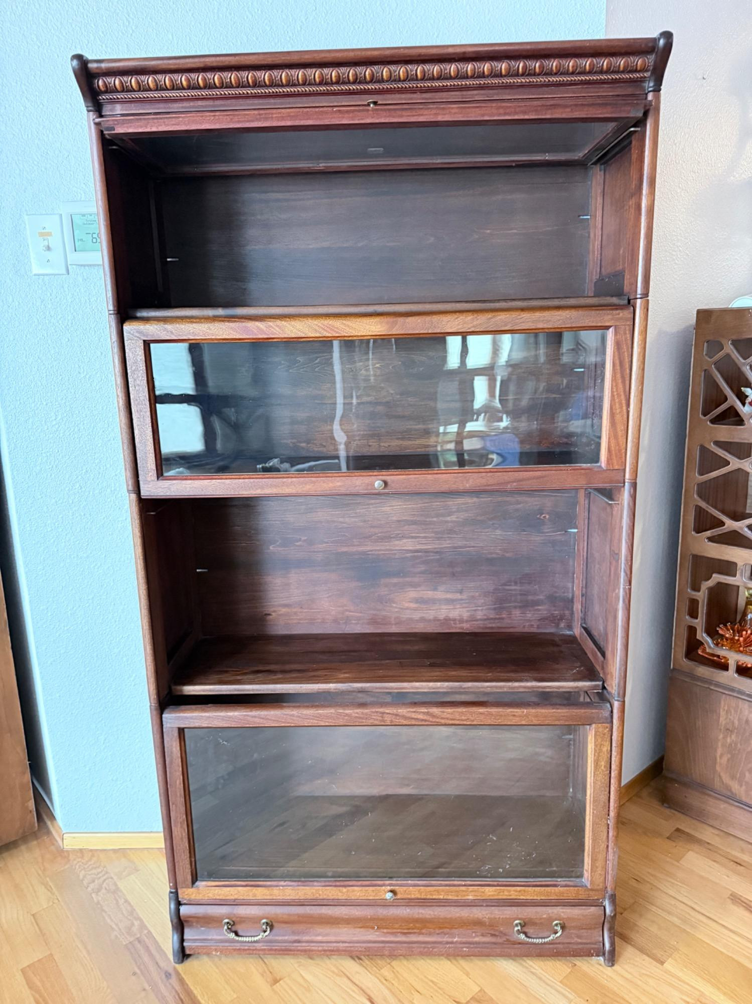 This antique lawyer’s barrister bookcase features stackable, modular sections with glass-front doors that lift and slide for easy access. The solid wood construction and classic panel detailing make it a functional and elegant storage piece. Features & Details: Modular Design: Sections separate and stack, allowing for customizable height Glass Lift-Up Doors: Protects books and collectibles from dust Solid Wood Construction: Rich, dark finish with carved top detailing Dimensions: 62.5” H x 33.75” W x 12” D Storage Drawer: Bottom section includes a pull-out drawer with brass-style handles Condition: Vintage with minor signs of wear, fully functional.