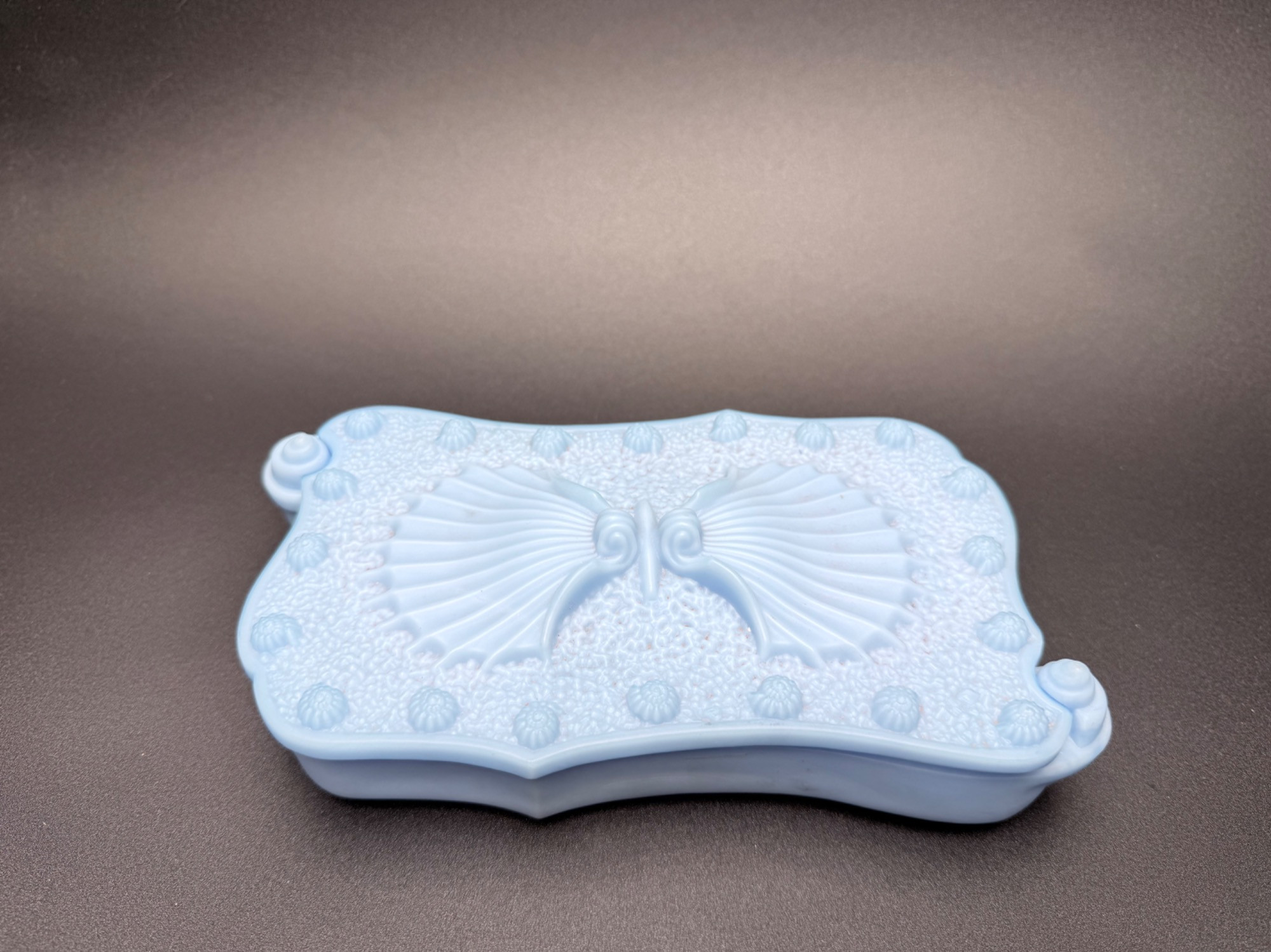 This charming vintage trinket box is crafted from opaque light blue glass and features a beautiful raised shell motif on the lid, surrounded by textured detailing and small shell accents. The box separates into two pieces – a fitted lid and a deep base with a divider, making it ideal for organizing jewelry, trinkets, or small keepsakes. The design and coloration suggest it might be a piece from Imperial Glass or a similar maker of early to mid-20th-century pressed glass. Dimensions: 9” x 5" x 2"