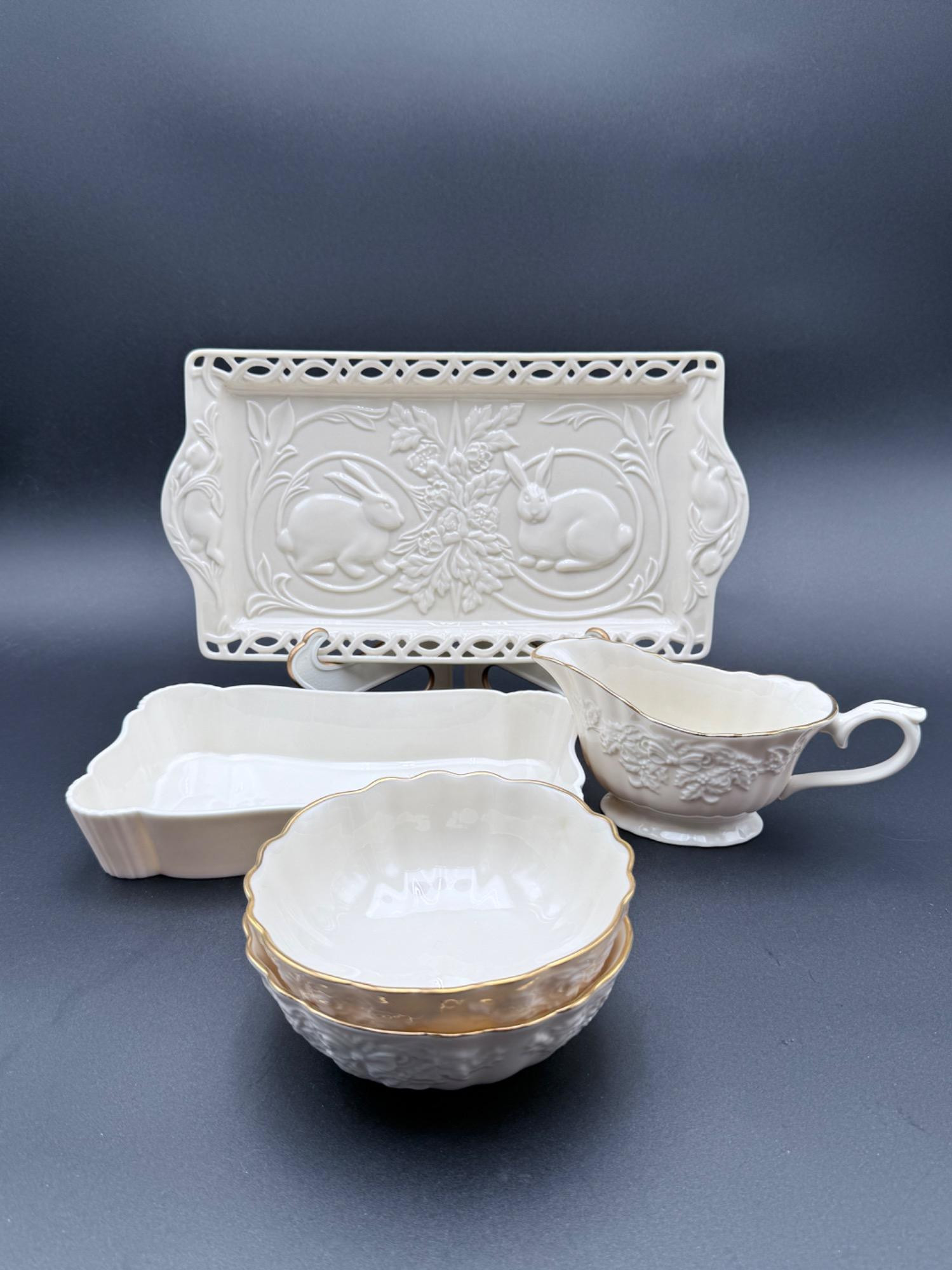 This beautiful Lenox Holiday Hostess Collection porcelain serving set is crafted in the USA and features classic ivory fine china with raised holly and ribbon detailing, finished with elegant gold trim. The set includes: Rectangular White Platter (9.5” x 5”) Two Bowls (5.5” diameter, 2” tall) Gravy Boat / Sauce Server (7.5” long x 3” wide, 3.5” tall) Bunny Tray (13” x 7”) Overall Condition: All pieces are in excellent pre-owned condition. Gold trim remains bright and intact.