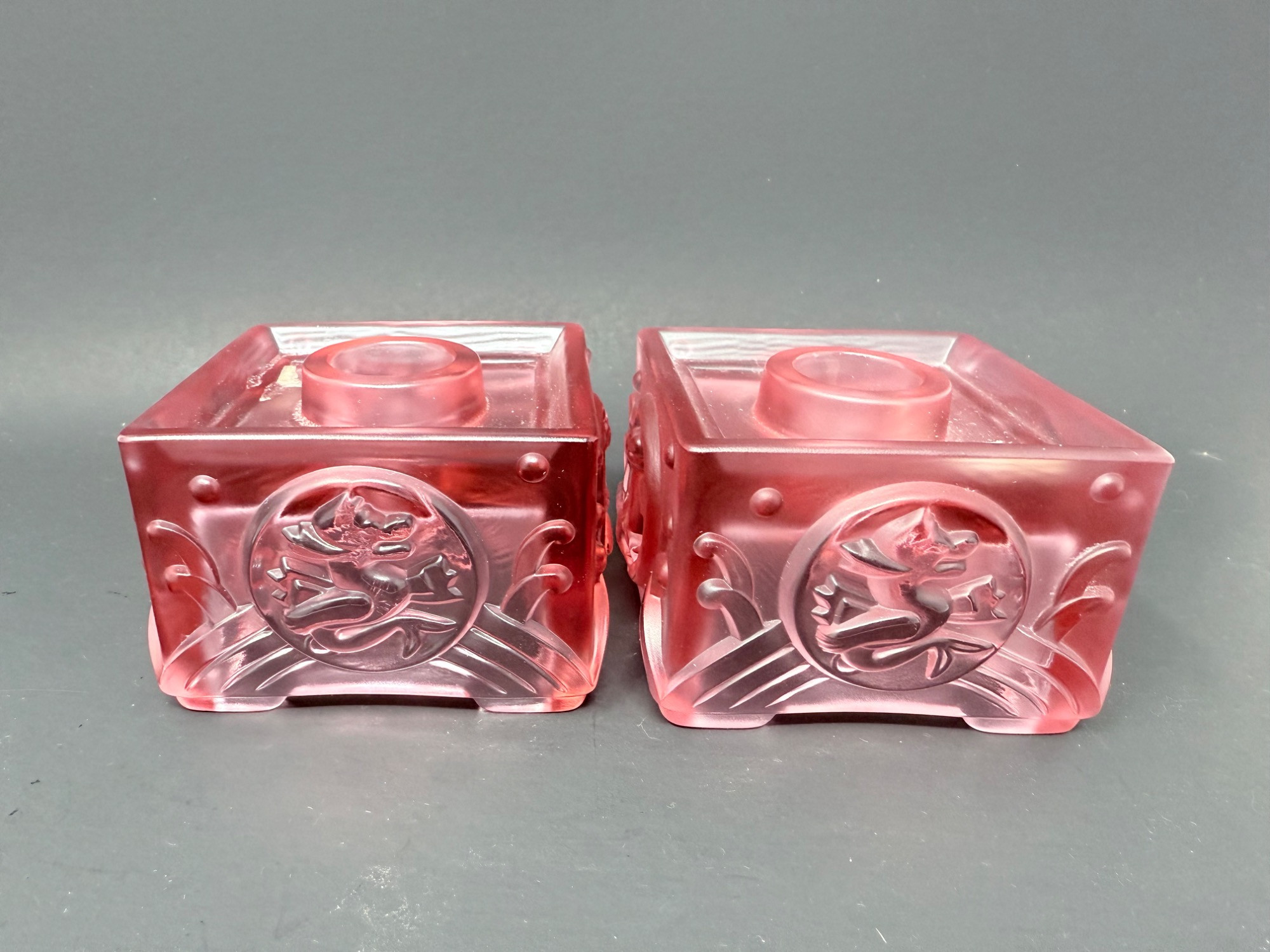 Pair of Imperial Glass Shein Cathay Candle Holders – Pink Satin Glass – 3.25" Square This is a striking pair of vintage Imperial Glass candle holders in the Shein Cathay pattern, featuring a bold Asian-inspired motif in richly colored pink satin glass. The front of each holder is decorated with a raised circular emblem of a prancing deer or gazelle amid stylized foliage, adding Art Deco appeal. Maker: Imperial Glass Company Pattern: Shein Cathay Color: Pink satin glass Dimensions (each): 3.25" wide x 3.25" deep x 2.5" tall Condition: Excellent vintage condition; no chips or cracks. Some white residue on one holder is from original adhesive label and can be removed if desired. Markings: One piece retains its original Imperial paper labelDetails: