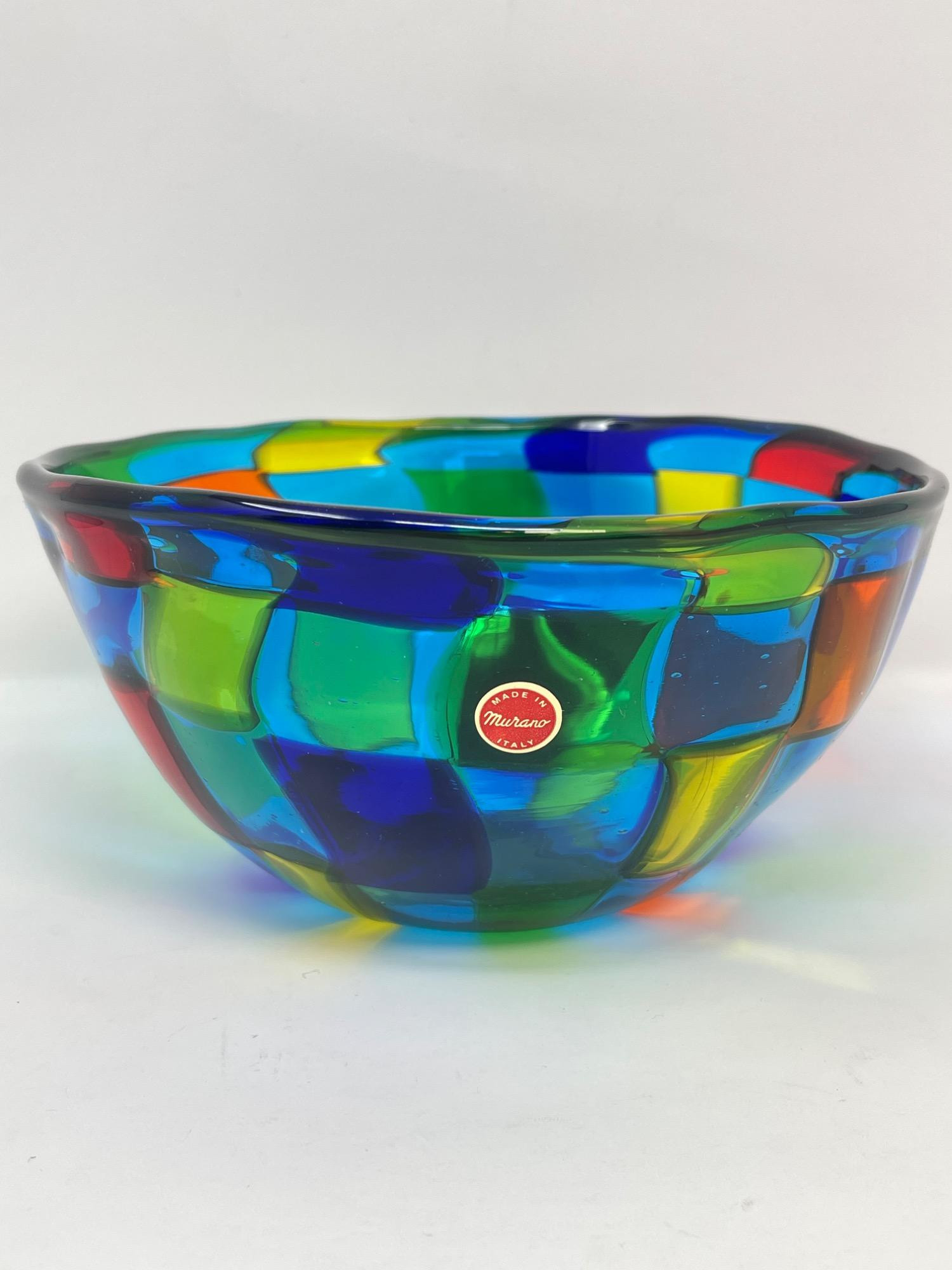 Handcrafted Murano art glass bowl by Angelo Ballarin featuring the distinctive Pezzato pattern in vibrant multicolor panels. This striking piece showcases traditional Venetian glassmaking techniques and is signed by the artist. Condition: Minor scuffs and scratches from use. No cracks or chips noted.