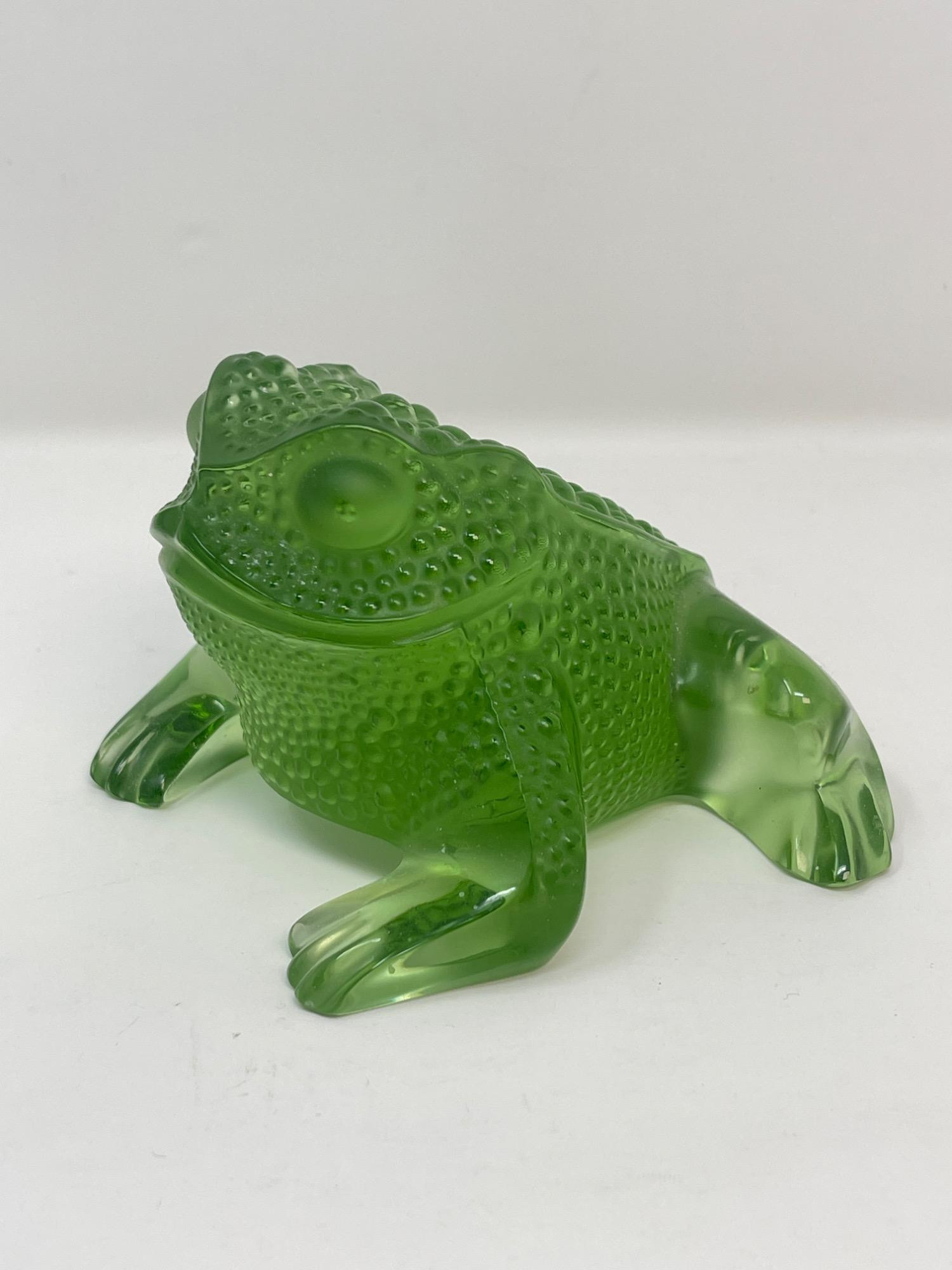 Lalique Gregoire Green Glass Frog This exquisite sculpture, titled "Gregoire," is a creation of the renowned French glassmaker Lalique. Crafted from vibrant green crystal, the piece depicts a toad in a poised stance, symbolizing wealth and adaptability in Chinese culture. The sculpture showcases Lalique's signature frosted and polished finishes, highlighting intricate details and the toad's confident expression. The "Gregoire" sculpture is a testament to Lalique's mastery in glass artistry, combining traditional symbolism with elegant design. This piece is signed by Lalique, ensuring its authenticity. Condition: Excellent condition with no visible chips, cracks, or flaws.