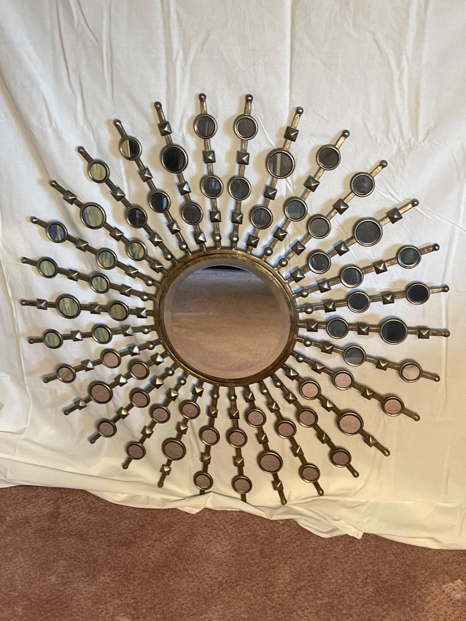 Striking wall mirror by Uttermost featuring a bold sunburst design with radiating rods adorned with circular and geometric accents. The antique bronze finish adds depth and warmth, while the central round mirror provides a clean reflective surface. A statement piece ideal for entryways, living rooms, or above a mantel. Condition: Excellent overall condition with minimal signs of wear.